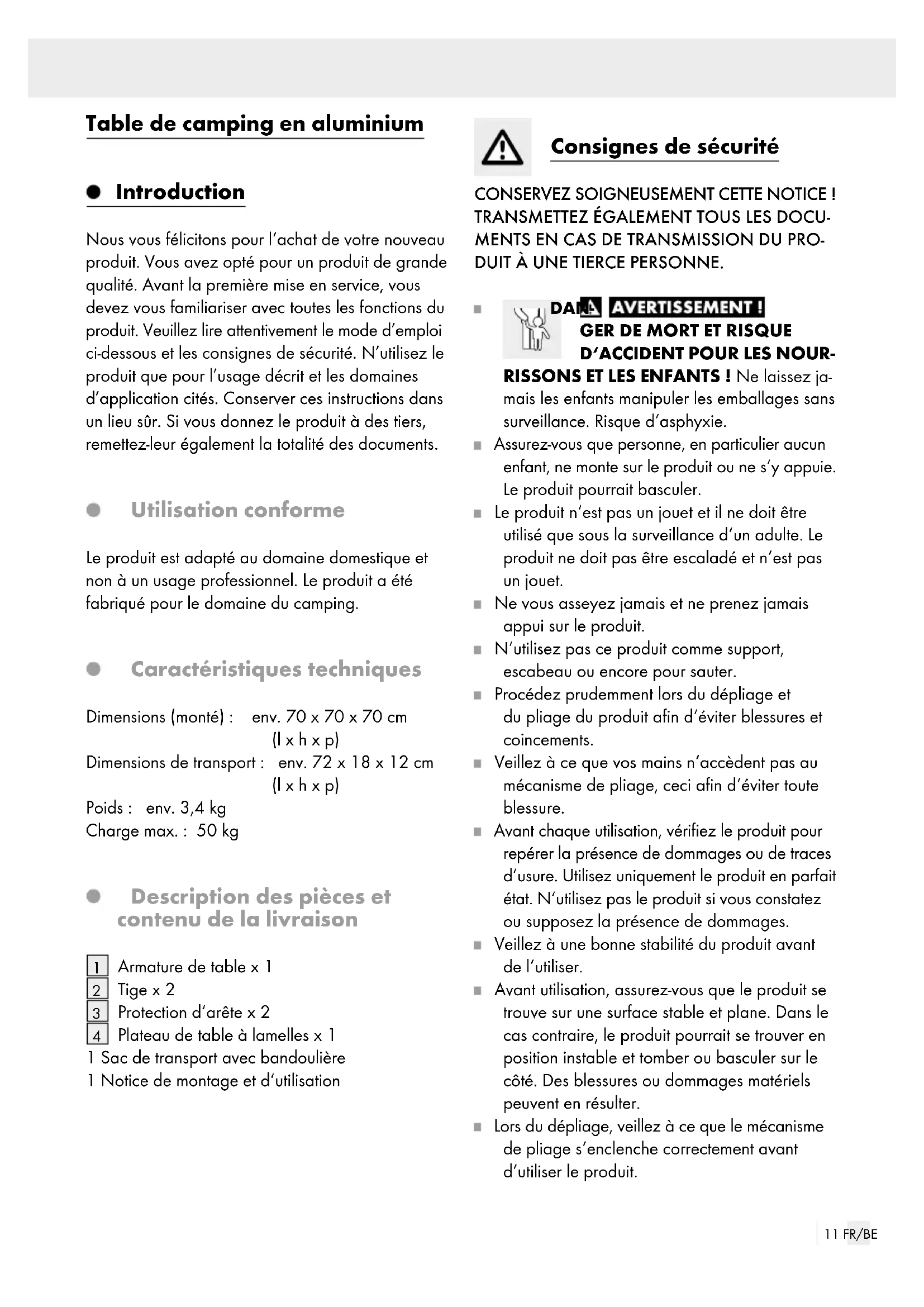 RISSONS ET LES ENFANTS! Ne laissez ja- mais les enfants manipuler les emballages sans surveillance. Risque d‘asphyxie. Assurez-vous que personne, en particulier aucun enfant, ne monte sur le produit ou ne s‘y appuie. Le produit pourrait basculer. Le produit n‘est pas un jouet et il ne doit être utilisé que sous la surveillance d‘un adulte. Le produit ne doit pas être escaladé et n‘est pas un jouet. Ne vous asseyez jamais et ne prenez jamais appui sur le produit. N‘utilisez pas ce produit comme support, escabeau ou encore pour sauter. Procédez prudemment lors du dépliage et du pliage du produit afin d‘éviter blessures et coincements. Veillez à ce que vos mains n‘accèdent pas au mécanisme de pliage, ceci afin d‘éviter toute blessure. Avant chaque utilisation, vérifiez le produit pour repérer la présence de dommages ou de traces d‘usure. Utilisez uniquement le produit en parfait état. N‘utilisez pas le produit si vous constatez ou supposez la présence de dommages. Veillez à une bonne stabilité du produit avant de l‘utiliser. Avant utilisation, assurez-vous que le produit se trouve sur une surface stable et plane. Dans le cas contraire, le produit pourrait se trouver en position instable et tomber ou basculer sur le côté. Des blessures ou dommages matériels peuvent en résulter. Lors du dépliage, veillez à ce que le mécanisme de pliage s‘enclenche correctement avant d‘utiliser le produit.12 FR/BE Veillez à ce que le produit soit complètement ouvert avant de l‘utiliser. N‘utilisez pas le produit à proximité d‘un feu ouvert. En cas de conditions météorologiques extrêmes, par ex. en cas de vent fort, sécurisez le produit. Utilisez le produit uniquement dans le cadre de son emploi prévu, comme meuble d‘extérieur dans le domaine du camping. Veuillez respecter la charge maximale (voir « Caractéristiques techniques »). Lorsque cette limite de poids est dépassée, il existe un risque de blessures et / ou de dommages matériels. Le montage simple et rapide du produit induit qu‘il n‘est pas aussi stable qu‘une table clas- sique. Ne chargez pas la table avec plus de 50 kg et évitez d‘exercer une charge latérale car cette table risquerait de basculer rapidement en raison de son faible poids, comparée à une table d‘extérieur ordinaire. N‘attachez pas de parasol à la table. Utilisez uniquement un parasol qui a sa propre armature. RISQUE DE DÉGÂTS MATÉRIELS ! Nous ne sommes en aucun cas responsables des accidents pouvant survenir en raison d‘une non-observation des remarques de sécurité exposées ci-dessus, ou en cas de manipulation incorrecte. Monter le produit Sortez le produit du sac de transport. Dépliez doucement et uniformément l‘armature de table