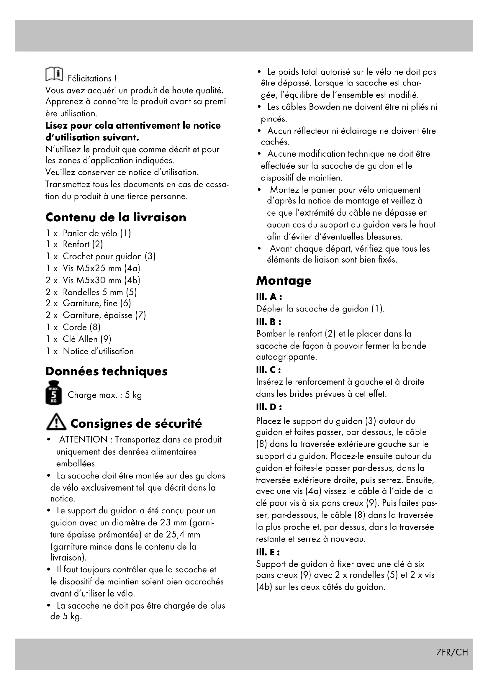 - présenter les qualités qu‘un acheteur peut légitimement attendre eu égard aux décla- rations publiques faites par le vendeur, par le producteur ou par son représentant, notam- ment dans la publicité ou l‘étiquetage ;9FR/CH 2° Ou présenter les caractéristiques définies d‘un commun accord par les parties ou être propre à tout usage spécial recherché par l‘acheteur, porté à la connaissance du vendeur et que ce dernier a accepté. Article L211-12 du Code de la consommation L‘action résultant du défaut de conformité se prescrit par deux ans à compter de la dé- livrance du bien. Article 1641 du Code civil Le vendeur est tenu de la garantie à raison des défauts cachés de la chose vendue qui la ren- dent impropre à l‘usage auquel on la destine, ou qui diminuent tellement cet usage que l‘acheteur ne l‘aurait pas acquise, ou n‘en aurait donné qu‘un moindre prix, s‘il les avait connus. Article 1648 1er alinéa du Code civil L‘action résultant des vices rédhibitoires doit être intentée par l‘acquéreur dans un délai de deux ans à compter de la découverte du vice. Les pièces détachées indispensables à l’utilisation du produit sont disponibles pendant la durée de la garantie du produit. IAN : 278525 Service Suisse Tel. : 0842 665566 (0,08 CHF/Min., mobile max. 0,40 CHF/Min.) E-Mail : deltasport@lidl.ch Veuillez trouver les pièces de rechange pour votre produit sur : www.delta-sport.com, rubrique Service - Service des pièces de rechange Lidl10 Congratulazioni! Con il vostro acquisto avete scelto un prodotto altamente qualitativo. Familiarizzate con il pro- dotto prima di prenderlo in funzione. Leggete attentamente le seguenti istru- zioni d´uso. Utilizzate il prodotto soltanto per lo scopo previsto e i campi d´impiego indicati. Conservate bene queste istruzioni. In caso di inoltro del prodotto a terzi, pregasi consegnare tutta la documentazione. Contenuto della confezione 1 x Cesto per bici (1) 1 x Rinforzo (2) 1 x Attacco per manubrio (3) 1 x Viti M5x25 mm (4a) 2 x Viti M5x30 mm (4b) 2 x Rondelle 5 mm (5) 2 x Inserti, sottile (6) 2 x Inserti, spesso (7) 1 x Corda (8) 1 x Chiave a brugola (9) 1 x Istruzioni d‘uso Dati tecnici Carico max.: 5 kg Avvertenze di sicurezza