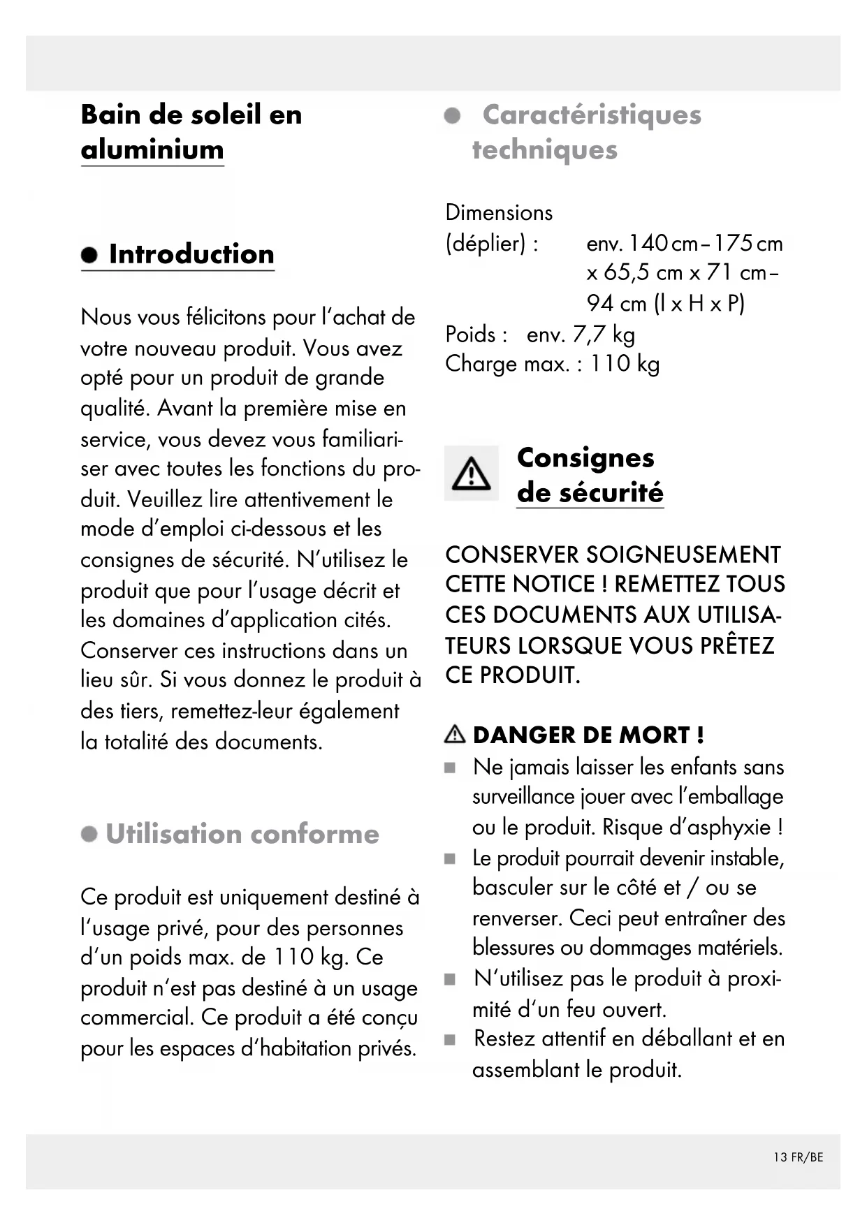 as been damaged, or used or m ain- tained improperly. The warranty applies to defects in material or manufacture. This war- ranty does not cover product parts subject to normal wear, thus possibly considered consumables (e.g. batter- ies) or for damage to fragile parts, e.g. switches, rechargeable batteries or glass parts. Warranty claim procedure To ensure quick processing of your case, please observe the following instructions: Please have the till receipt and the item number (e.g. IAN 123456_7890) available as proof of purchase. You will find the item number on the rating plate, an engraving on the front page of the instructions for use (bottom left), or as a sticker on the rear or bottom of the product. If functional or other defects occur, please contact the service departm ent12 GB/IE listed either by telephone or by e- mail. You can return a defective product to us free of charge to the service address that will be provided to you. Ensure that you enclose the proof of purchase (till receipt) and informa- tion about what the defect is and when it occurred. Service Service Great Britain Tel.: 08000569216 E-Mail: owim@lidl.co.uk Service Ireland Tel.: 1800 200736 E-Mail: owim@lidl.ie13 FR/BE Bain de soleil en aluminium Introduction Nous vous félicitons pour l‘achat de votre nouveau produit. Vous avez opté pour un produit de grande qualité. Avant la première mise en service, vous devez vous familiari- ser avec toutes les fonctions du pro- duit. Veuillez lire attentivement le mode d’emploi ci-dessous et les consignes de sécurité. N’utilisez le produit que pour l’usage décrit et les domaines d’application cités. Conserver ces instructions dans un lieu sûr. Si vous donnez le produit à des tiers, remettez-leur également la totalité des documents. Utilisation conforme Ce produit est uniquement destiné à l‘usage privé, pour des personnes d‘un poids max. de 110 kg. Ce produit n‘est pas destiné à un usage commercial. Ce produit a été conçu pour les espaces d‘habitation privés. Caractéristiques techniques Dimensions (déplier) : env. 140 cm–175 cm x 65,5 cm x 71 cm– 94 cm (l x H x P) Poids : env. 7,7 kg Charge max. : 110 kg Consignes de sécurité CONSERVER SOIGNEUSEMENT