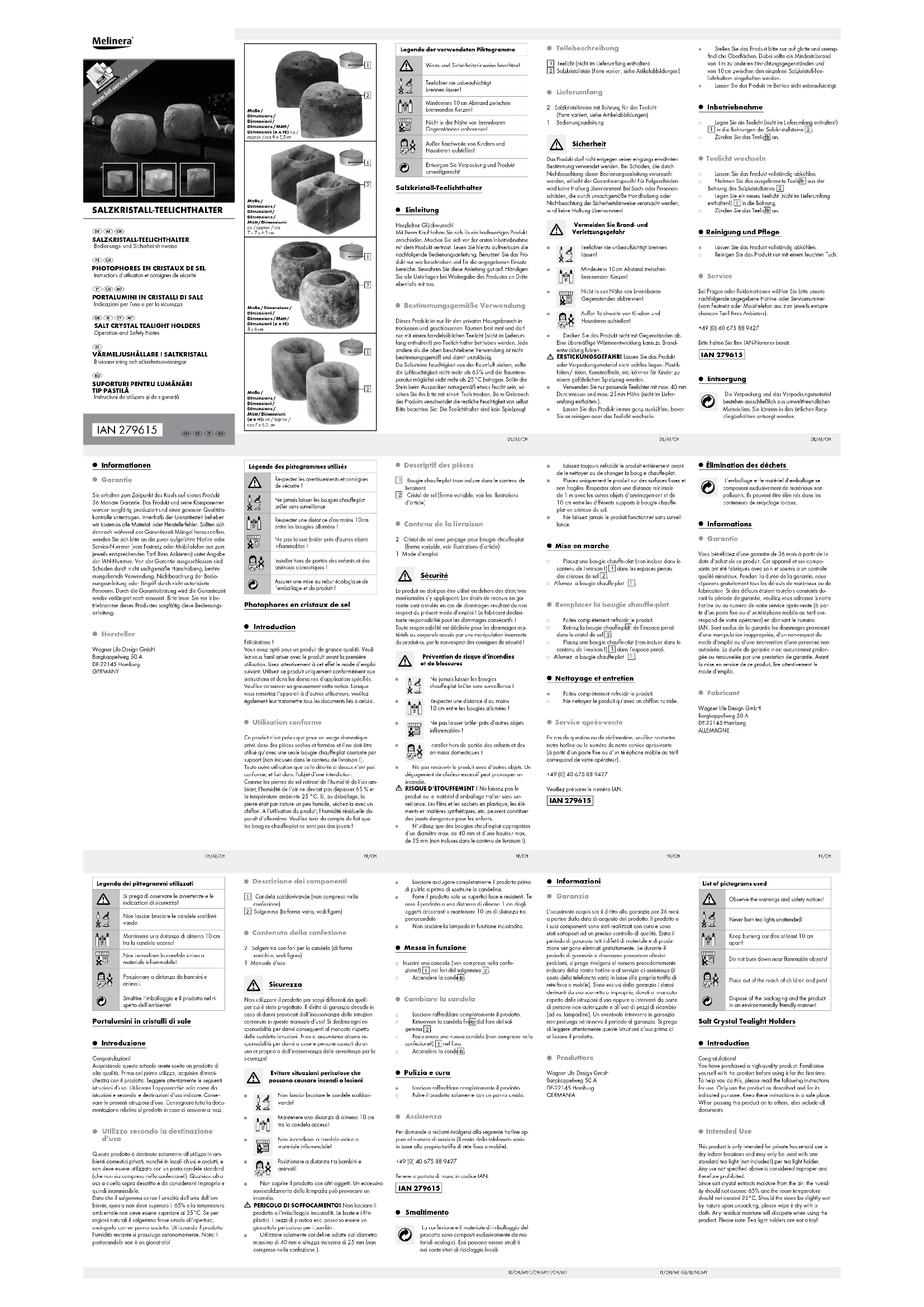 Cristal de sel (forme variable, voir les illustrations d‘article) Contenu de la livraison 2 Cristal de sel avec perçage pour bougie chauffe-plat (forme variable, voir illustrations d‘article) 1 Mode d‘emploi Sécurité Le produit ne doit pas être utilisé en dehors des directives mentionnées s‘y appliquant. Les droits de recours en ga- rantie sont annulés en cas de dommages résultant du non respect du présent mode d’emploi ! Le fabricant décline toute responsabilité pour les dommages consécutifs! Toute responsabilité est déclinée pour les dommages ma- tériels ou corporels causés par une manipulation incorrecte du produit ou par le non-respect des consignes de sécurité! Prévention de risque d‘incendies et de blessures Ne jamais laisser les bougies chauffe-plat brûler sans surveillance ! Respecter une distance d‘au moins 10 cm entre les bougies allumées ! Ne pas laisser brûler près d‘autres objets inflammables ! Installer hors de portée des enfants et des animaux domestiques ! Ne pas recouvrir le produit avec d‘autres objets. Un dégagement de chaleur excessif peut provoquer un incendie. RISQUE D‘ÉTOUFFEMENT ! Ne laissez pas le produit ou le matériel d‘emballage traîner sans sur- veillance. Les films et les sachets en plastique, les élé- ments en matières synthétiques, etc. peuvent constituer des jouets dangereux pour les enfants. N‘utilisez que des bougies chauffe-plat appropriées d‘un diamètre max. de 40 mm et d‘une hauteur max. de 25 mm (non incluses dans le contenu de livraison !). Légende des pictogrammes utilisés Respecter les avertissements et consignes de sécurité ! Ne jamais laisser les bougies chauffe-plat brûler sans surveillance ! Respecter une distance d'au moins 10 cm entre les bougies allumées ! Ne pas laisser brûler près d'autres objets inflammables ! Installer hors de portée des enfants et des animaux domestiques ! Assurer une mise au rebut écologique de l’emballage et du produit ! Photophores en cristaux de sel Introduction Félicitations ! Vous avez opté pour un produit de grande qualité. Veuil- lez-vous familiariser avec le produit avant la première utilisation. Lisez attentivement à cet effet le mode d’emploi suivant. Utilisez ce produit uniquement conformément aux instructions et dans les domaines d’application spécifiés. Veuillez conserver soigneusement cette notice. Lorsque vous remettez l‘appareil à d‘autres utilisateurs, veuillez également leur transmettre tous les documents liés à celui-ci. Utilisation conforme Ce produit n‘est prévu que pour un usage domestique privé dans des pièces sèches et fermées et il ne doit être utilisé qu‘avec une seule bougie chauffe-plat courante par support (non incluses dans le contenu de livraison !). Toute autre utilisation que celle décrite ci-dessus n‘est pas conforme, et fait donc l‘objet d‘une interdiction. Comme les pierres de sel retirent de l‘humidité de l‘air am- biant, l‘humidité de l‘air ne devrait pas dépasser 65 % et la température ambiante 25 °C. Si, au déballage, la pierre était par nature un peu humide, séchez-la avec un chiffon. À l‘utilisation du produit, l‘humidité résiduelle dis- paraît d‘elle-même. Veuillez tenir du compte du fait que les bougies chauffe-plat ne sont pas des jouets ! Informationen Garantie Sie erhalten zum Zeitpunkt des Kaufs auf dieses Produkt 36 Monate Garantie. Das Produkt und seine Komponenten wurden sorgfältig produziert und einer genauen Qualitäts- kontrolle unterzogen. Innerhalb der Garantiezeit beheben wir kostenlos alle Material- oder Herstellerfehler. Sollten sich dennoch während der Garantiezeit Mängel herausstellen, wenden Sie sich bitte an die zuvor aufgeführte Hotline oder Service-Nummer (vom Festnetz oder Mobiltelefon aus zum jeweils entsprechenden Tarif Ihres Anbieters) unter Angabe der IAN-Nummer. Von der Garantie ausgeschlossen sind Schäden durch nicht sachgemäße Handhabung, bestim- mungsfremde Verwendung, Nichtbeachtung der Bedie- nungsanleitung oder Eingriff durch nicht autorisierte Personen. Durch die Garantieleistung wird die Garantiezeit weder verlängert noch erneuert. Bitte lesen Sie vor Inbe- triebnahme dieses Produktes sorgfältig diese Bedienungs- anleitung. Hersteller Wagner Life Design GmbH Bargkoppelweg 50 A DE-22145 Hamburg GERMANY Stellen Sie das Produkt bitte nur auf glatte und unemp- findliche Oberflächen. Dabei sollte ein Mindestabstand von 1 m zu anderen Einrichtungsgegenständen und von 10 cm zwischen den einzelnen Salzkristall-Tee- lichthaltern eingehalten werden. Lassen Sie das Produkt im Betrieb nicht unbeaufsichtigt. Inbetriebnahme Legen Sie ein Teelicht (nicht im Lieferumfang enthalten!)
