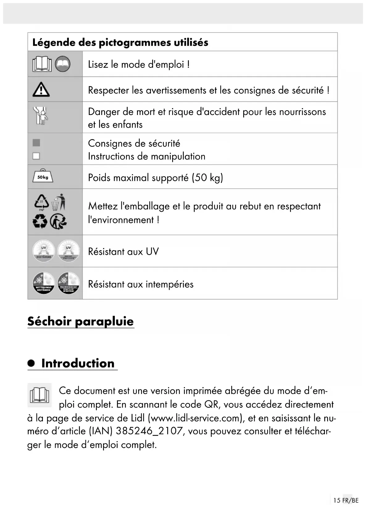PAP Mettez l'emballage et le produit au rebut en respectant l'environnement! Résistant aux UV Résistant aux intempéries Séchoir parapluie Introduction Ce document est une version imprimée abrégée du mode d‘em- ploi complet. En scannant le code QR, vous accédez directement à la page de service de Lidl (www.lidl-service.com), et en saisissant le nu- méro d‘article (IAN) 385246_2107, vous pouvez consulter et téléchar- ger le mode d‘emploi complet.16 FR/BE AVERTISSEMENT! Respectez le mode d‘emploi complet et les consignes de sécurité afin d‘éviter tout dommage corporel et matériel. Le guide de démarrage rapide fait partie intégrante de ce produit. Avant d‘utiliser le produit, familiarisez-vous avec toutes les instructions d‘utilisation et de sécurité. Conservez le guide de démarrage rapide dans un endroit sûr et remettez tous les documents lorsque vous transmettez le produit à un tiers. Utilisation conforme Ce produit est un séchoir à linge. Utilisation uniquement en extérieur. Toute modification du produit est interdite et conduit à des dommages. Il peut de surcroît en résulter d‘autres risques mortels ou blessures. Ce pro- duit a été exclusivement conçu pour un usage privé. Il n‘est pas destiné à un usage commercial. Le fabricant décline toute responsabilité en cas d‘utilisation incorrecte. Descriptif des éléments