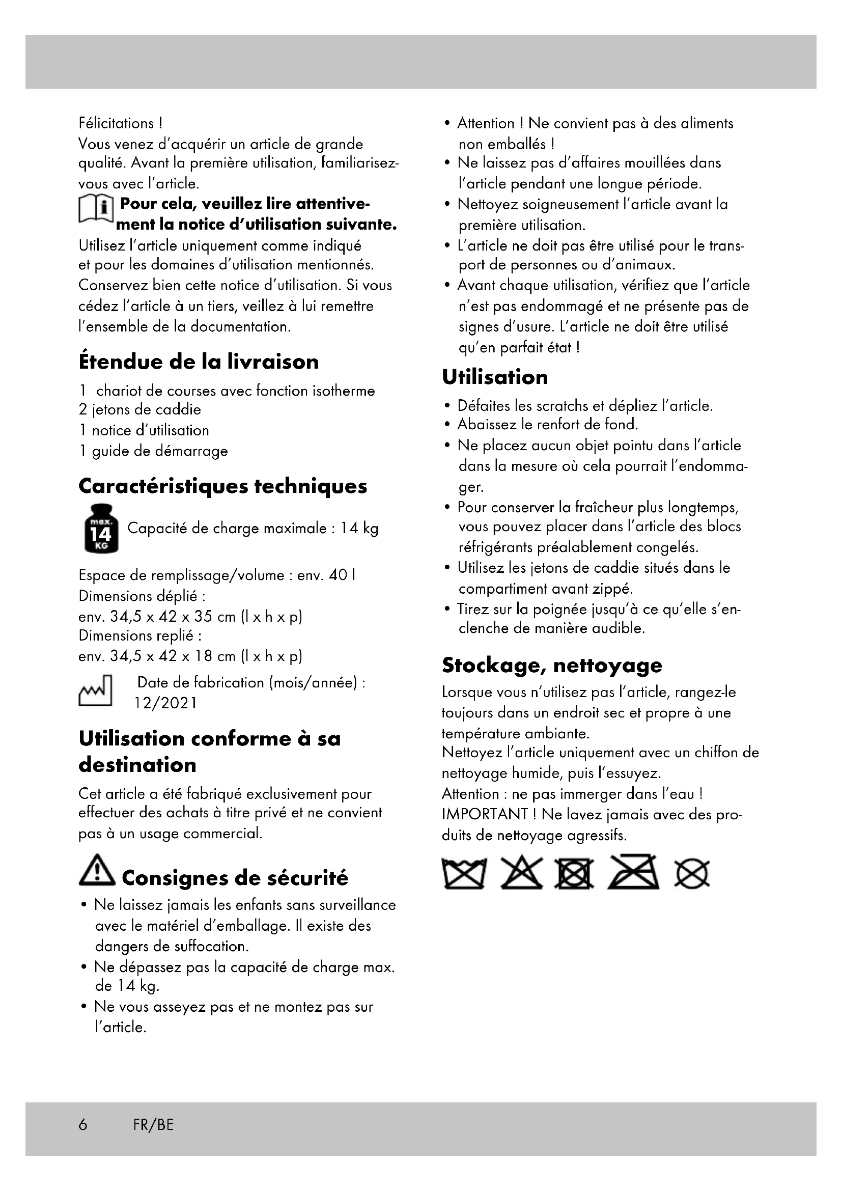 Capacité de charge maximale : 14 kg Espace de remplissage/volume : env. 40 l Dimensions déplié : env. 34,5 x 42 x 35 cm (l x h x p) Dimensions replié : env. 34,5 x 42 x 18 cm (l x h x p) Date de fabrication (mois/année) : 12/2021 Utilisation conforme à sa destination Cet article a été fabriqué exclusivement pour effectuer des achats à titre privé et ne convient pas à un usage commercial. Consignes de sécurité