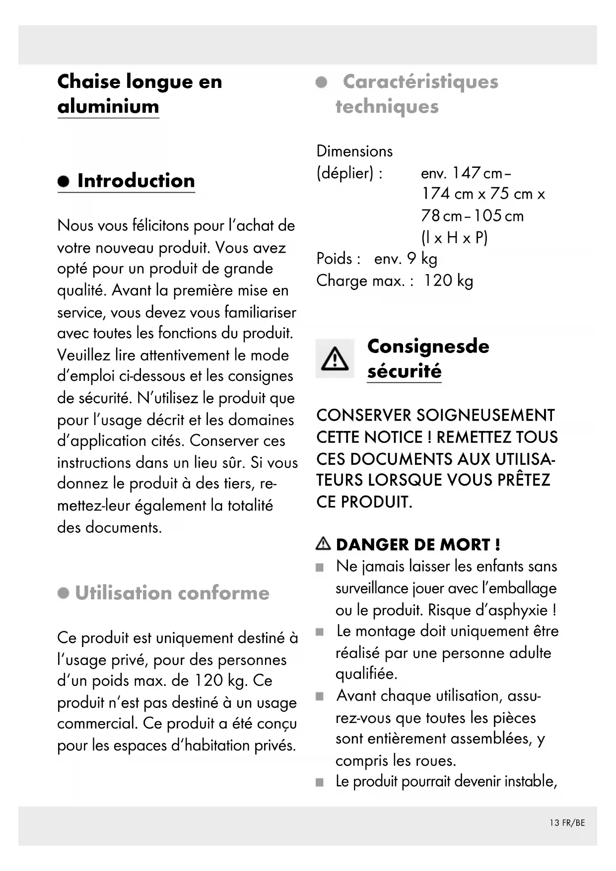 En cas de défaillance, vous êtes en droit de retourner ce produit au vendeur. La présente garantie ne constitue pas une restriction de vos droits légaux. Ce produit bénéficie d‘une garantie de 3 ans à compter de sa date d’achat. La durée de garantie débute à la date d’achat. Veuillez conserver le ticket de caisse original. Il fera office de preuve d’achat. Si un problème matériel ou de fabrication devait survenir dans 3 ans suivant la date d‘achat de ce produit, nous assurons à notre discrétion la réparation ou le rem- placement du produit sans frais supplémentaires. La garantie prend fin si le produit est endommagé suite à une utilisation inappropriée ou à un entretien défaillant. La garantie couvre les vices matériels et de fabrication. Cette garantie ne s’étend ni aux pièces du produit soumises à une usure normale (p. ex. des piles) et qui, par conséquent, peuvent être considérées comme des pièces d’usure, ni aux dommages sur des composants fragiles, comme des interrupteurs, des batteries ou des éléments fabriqués en verre. Faire valoir sa garantie Pour garantir la rapidité d’exécution de la procédure de garantie, veuil- lez respecter les indications sui- vantes : Veuillez conserver le ticket de caisse et la référence du produit (par ex. IAN 123456_7890) à titre de preuve d’achat pour toute demande. Le numéro de référence de l’article est indiqué sur la plaque d’identifi- cation, gravé sur la page de titre de votre manuel (en bas à gauche) ou sur un autocollant apposé sur la face arrière ou inférieure du produit. En cas de dysfonctionnement du produit, ou de tout autre défaut, contactez en premier lieu le service après-vente par téléphone ou par e-mail aux coordonnées indiquées ci-dessous. Vous pouvez alors envoyer franco de port tout produit considéré comme défectueux au service clientèle indi- qué, accompagné de la preuve d’achat (ticket de caisse) et d’une18 FR/BE description écrite du défaut avec mention de sa date d’apparition. Service après-vente Service après-vente France Tél. : 0800904879 E-Mail : owim@lidl.fr Service après-vente Belgique Tél. : 080071011 Tél. : 80023970 (Luxembourg) E-Mail : owim@lidl.be19 NL/BE Aluminium ligstoel Inleiding Hartelijk gefeliciteerd met de aan- koop van uw nieuwe product. U hebt voor een hoogwaardig product gekozen. Maak u voor de eerste in- gebruikname vertrouwd met het product. Lees hiervoor aandachtig de volgende gebruiksaanwijzing en de veiligheidsvoorschriften. Ge- bruik het product alleen zoals be- schreven en voor de aangegeven toepassingsgebieden. Bewaar deze gebruiksaanwijzing op een veilige plek. Geef, wanneer u het product doorgeeft aan derden, ook alle do- cumenten mee. Correct gebruik Het product is bestemd voor privége- bruik van personen met een maxim aal gewicht van 120 kg. Het product is niet bestemd voor commercieel ge- bruik. Het product werd geproduce erd voor woningen van particulieren. Technische gegevens Afmetingen (uitgevouwen): ca. 147 cm‒ 174 cm x 75 cm x 78 cm‒105 cm (B x H x D) Gewicht: ca. 9 kg Max. belasting: 120 kg Veiligheidsinstructies