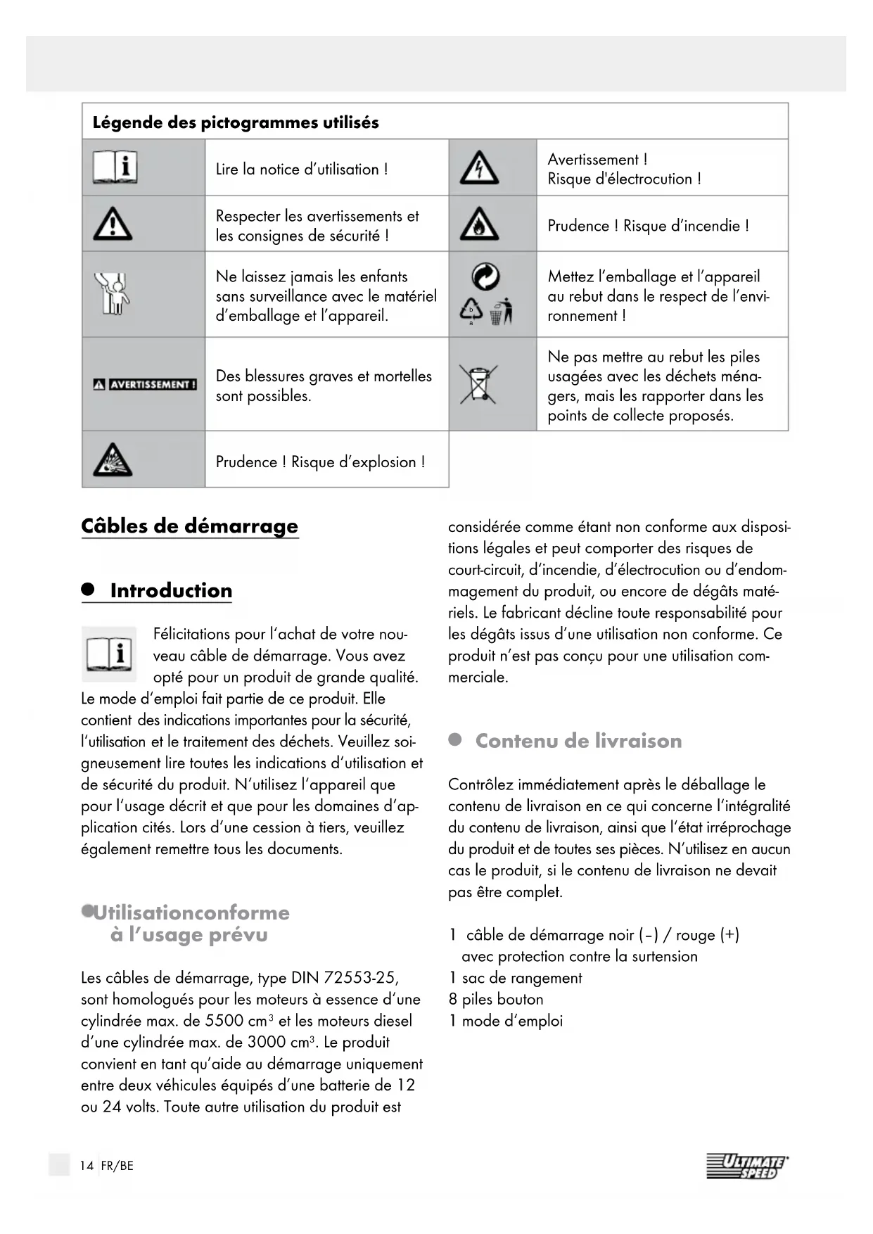 Contenu de livraison Contrôlez immédiatement après le déballage le contenu de livraison en ce qui concerne l‘intégralité du contenu de livraison, ainsi que l‘état irréprochage du produit et de toutes ses pièces. N‘utilisez en aucun cas le produit, si le contenu de livraison ne devait pas être complet. 1 câble de démarrage noir (–) / rouge (+) avec protection contre la surtension 1 sac de rangement 8 piles bouton 1 mode d‘emploi15 FR/BE Introduction / Sécurité