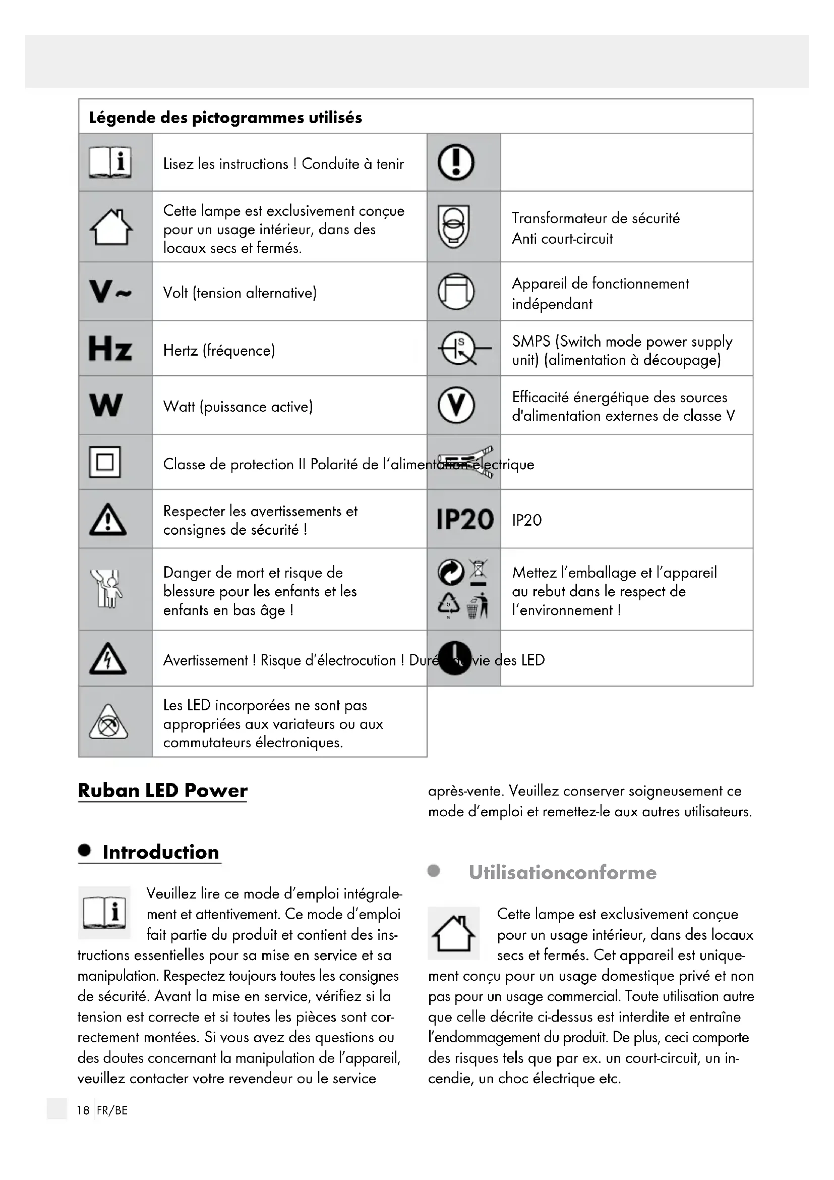 Mettez l’emballage et l’appareil au rebut dans le respect de l‘environnement ! Avertissement ! Risque d’électrocution! Durée de vie des LED Les LED incorporées ne sont pas appropriées aux variateurs ou aux commutateurs électroniques. Ruban LED Power Introduction Veuillez lire ce mode d’emploi intégrale- ment et attentivement. Ce mode d’emploi fait partie du produit et contient des ins- tructions essentielles pour sa mise en service et sa manipulation. Respectez toujours toutes les consignes de sécurité. Avant la mise en service, vérifiez si la tension est correcte et si toutes les pièces sont cor- rectement montées. Si vous avez des questions ou des doutes concernant la manipulation de l’appareil, veuillez contacter votre revendeur ou le service après-vente. Veuillez conserver soigneusement ce mode d’emploi et remettez-le aux autres utilisateurs. Utilisation conforme Cette lampe est exclusivement conçue pour un usage intérieur, dans des locaux secs et fermés. Cet appareil est unique- ment conçu pour un usage domestique privé et non pas pour un usage commercial. Toute utilisation autre que celle décrite ci-dessus est interdite et entraîne l’endommagement du produit. De plus, ceci comporte des risques tels que par ex. un court-circuit, un in- cendie, un choc électrique etc.19 FR/BE Introduction / SécuritéIntroduction Contenu de la livraison Après le déballage du produit, contrôlez toujours et immédiatement que le contenu de la livraison est complet et que l’appareil se trouve en parfait état. 1 Ruban LED Power 1 Support de câble 1 Bande adhésive 1 Mode d’emploi Descriptif des pièces