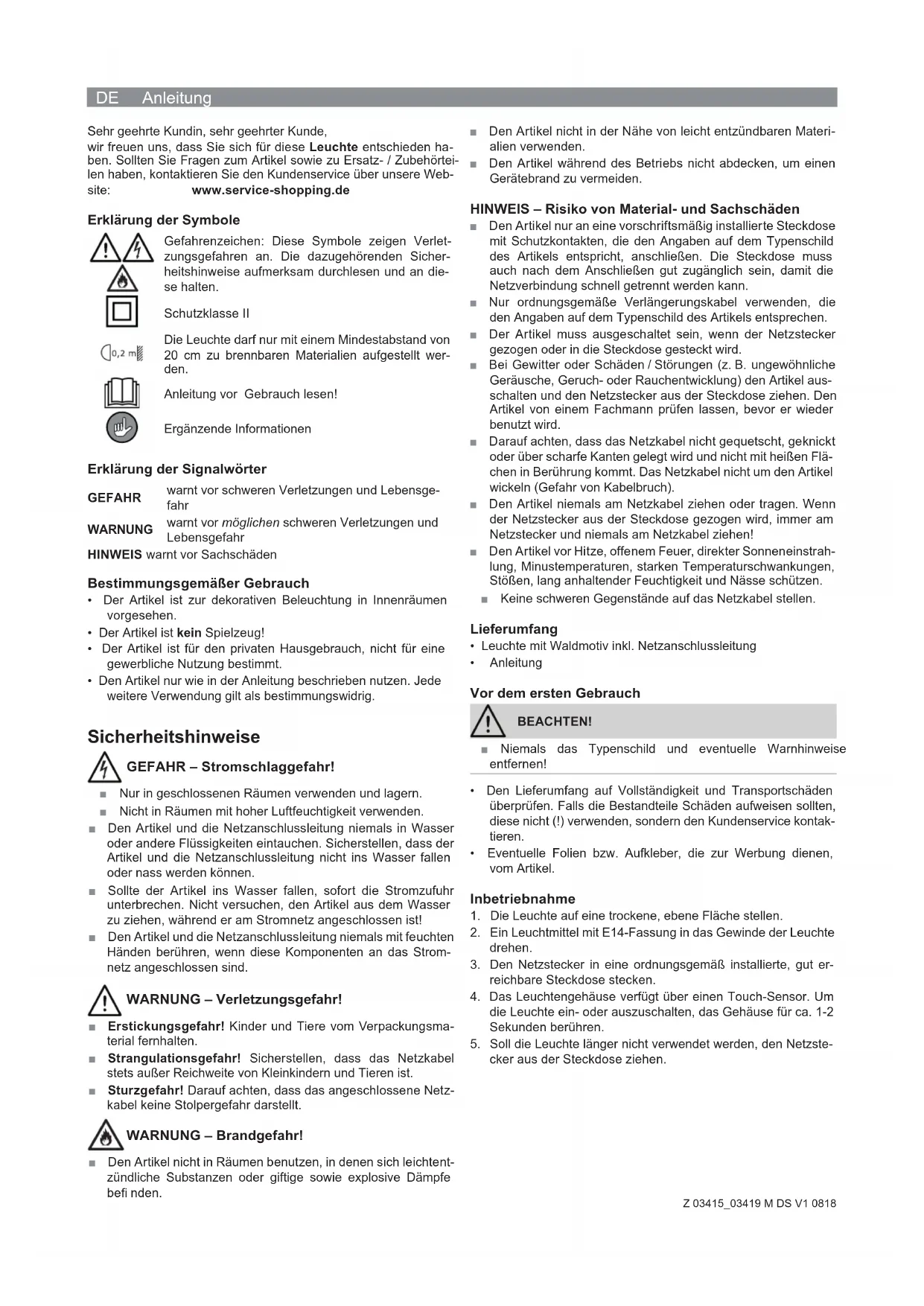 - Check the fuse of the mains connection. Technical Data Article number: 03415 (white) 03419 (black) Model number: JT-17L-W / JT-17L-B Power supply: 220 – 240 V ~ 50 Hz Power: 5 W Protection class: II Disposal Dispose of the packaging material in an environmentally friendly manner so that it can be recycled. This article is governed by the European Directive 2012/19/ EU on waste electrical and electronic equipment (WEEE). Do not dispose of this article as normal domestic waste, but rather in an environmentally friendly manner via an offi cially approved waste disposal company. Z 03415_03419 M DS V1 0818FR Mode d'emploi Chère cliente, cher client, Nous vous félicitons d'avoir fait l'acquisition de cette lampe. Pour toute question concernant l'article et ses pièces de rechange et accessoires, vous pouvez contacter le service après-vente à par- tir de notre site Internet : www.service-shopping.de Explication des symboles Mention de danger : ces symboles signalent des risques de blessure. Lisez et observez attentive- ment les consignes de sécurité correspondantes. Classe de protection II La lampe doit se trouver à une distance minimum de 20 cm de toute matière infl ammable. Consultez le mode d'emploi avant utilisation ! Informations complémentaires Explication des mentions d’avertissement DANGER Vous avertit d'un risque de blessures graves et mortelles AVERTISSEMENT Vous avertit d’un risque potentiel de blessures graves et mortelles AVIS Vous avertit d'un risque de dégâts matériels Utilisation conforme