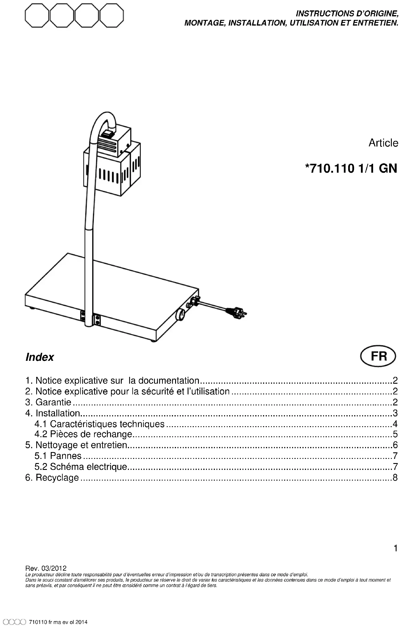 - 6. Recyclage FR710110 fr ma ev ol 2014 Rev. 03/2012 Le producteur décline toute responsabilité pour d’éventuelles erreur d’impression et/ou de transcription présentes dans ce mode d’emploi. Dans le souci constant d’améliorer ses produits, le producteur se réserve le droit de varier les caractéristiques et les données contenues dans ce mode d’emploi à tout moment et sans préavis, et par conséquent il ne peut être considéré comme un contrat à l’égard de tiers. p. 8