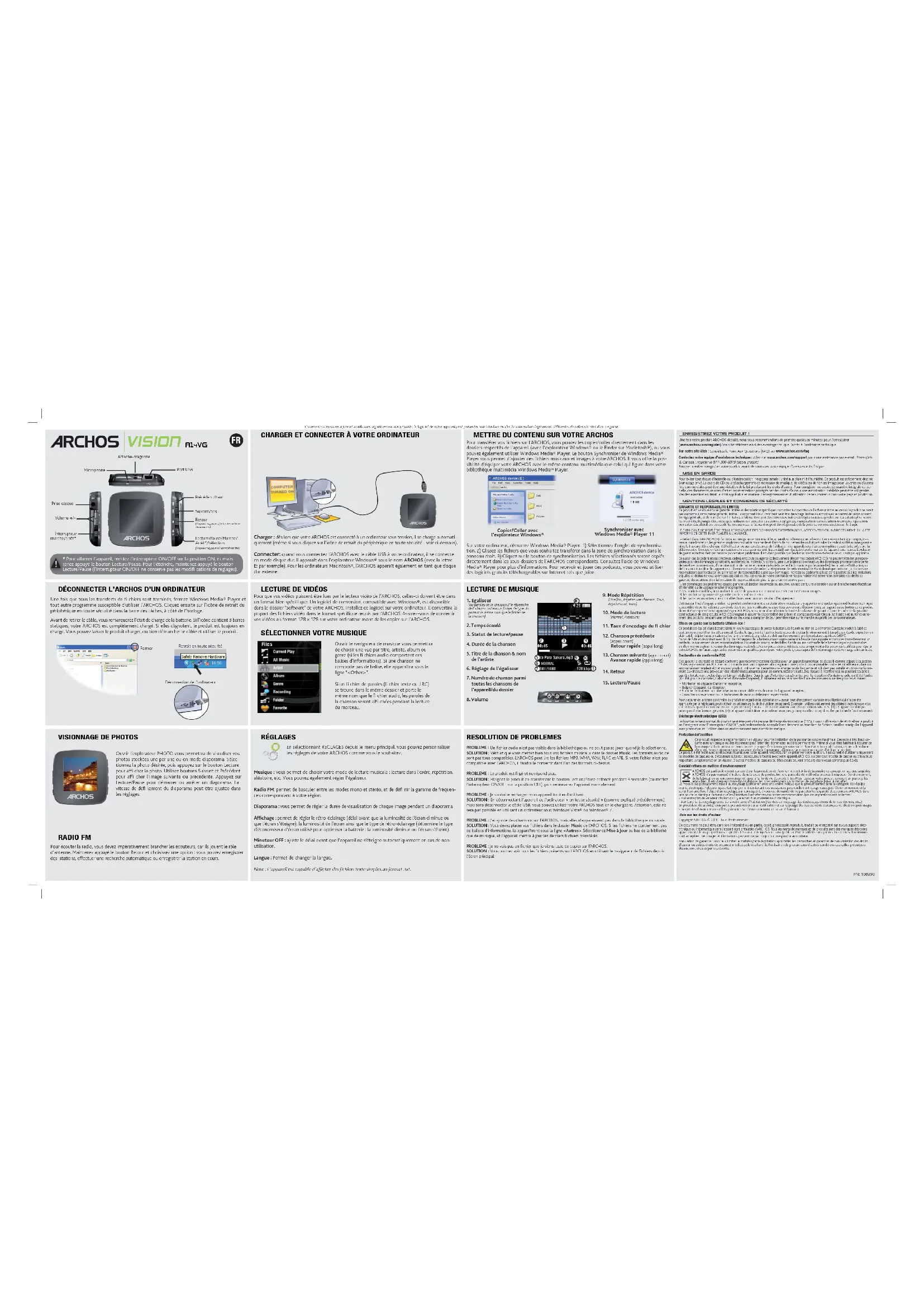 VISion A14VG ENREGISTREZ VOTRE PRODUIT !Une fois votre produit ARCHOS déballé, nous vous recommandons de prendre quelques minutes pour l’enregistrer (www.archos.com/register). Vous bénéfi cierez ainsi des avantages tel que l’accès à l’assistance technique. Sur notre site Web : Consultez la Foire Aux Questions (FAQ) sur www.archos.com/faq Contactez notre équipe d’assistance technique : Allez sur www.archos.com/support pour une assistance par e-mail. Etats-Unis & Canada : Appeler le 877-300-8879 (appel gratuit)Europe : veuillez enregistrer votre produit avant de contacter notre équipe d’assistance techniqueMISE EN GARDE Pour éviter tout risque d’incendie ou d’électrocution, n’exposez jamais l’unité à la pluie ni à l’humidité. Ce produit est strictement destiné à un usage privé. La copie de CD ou le téléchargement de morceaux de musique, de vidéos ou de fi chiers image pour la vente ou d’autres fi ns commerciales peut être une violation de la loi protégeant les droits d’auteur. Pour enregistrer ou copier, de manière intégrale ou par- tielle, des documents, œuvres d’art et représentations protégés par des droits d’auteur, une autorisation préalable peut être obligatoire. Veuillez examiner en détail le droit applicable en matière d’enregistrement et d’utilisation de tels contenus dans votre pays et juridiction. MENTIONS LÉGALES ET CONSIGNES DE SÉCURITÉGARANTIE ET RESPONSABILITÉ LIMITÉE Ce produit est vendu avec une garantie limitée et des solutions spécifi ques sont mises à disposition de l’acheteur initial au cas où le produit ne serait pas conforme à cette même garantie limitée. La responsabilité du fabricant peut être davantage limitée en accord avec le contrat de vente consenti. En règle générale, et de manière non limitative, le fabricant ne peut être tenu responsable des dégâts causés au produit par des catastrophes naturel- les, incendies, décharges électrostatiques, utilisations incorrectes ou abusives, négligences, manipulations ou installations incorrectes, réparations non autorisées, altérations ou accidents. En aucun cas, le fabricant ne peut être responsable de la perte de données stockées sur le disque. LE FABRICANT NE PEUT ÊTRE TENU RESPONSABLE DES DOMMAGES EXCEPTIONNELS, ACCIDENTELS OU INDIRECTS MEME S’IL A ETE INFORME DE CETTE EVENTUALITE A L’AVANCE. Le cédant (la société ARCHOS) n’accorde aucune garantie concernant les appareils sous licence, que celle-ci soit expresse ou tacite, y compris, mais sans aucune limitation, les garanties implicites de qualité marchande et d’aptitude pour atteindre un but particulier. Le cédant n’offre aucune garantie ni ne fait aucune démarche quant à l’utilisation ou aux conséquences de l’utilisation des appareils sous licence en matière d’exactitude, précision, fi a- bilité ou autre. En outre, en tant que cessionnaire vous assumez tout risque relatif aux résultats et performances de l’appareil sous licence. L’exclusion de garanties tacites n’est pas permise par certaines juridictions. Il est donc possible que l’exclusion mentionnée ci-dessus ne vous soit pas applicable. En aucun cas, le cédant et ses directeurs, cadres, employés ou agents (collectivement dénommés cédant ARCHOS) ne peuvent être tenus respon- sables pour des dommages consécutifs, accidentels ou indirects (y compris, sans que la liste soit exhaustive, des dommages provenant de la perte de bénéfi ces commerciaux, d’une interruption de l’activité commerciale, de la perte d’informations professionnelles) découlant de l’utilisation, ou de l’incapacité à utiliser les appareils sous licence même si le cédant a été prévenu de cette éventualité. Étant donné que certaines juridictions ne reconnaissent pas l’exclusion ou la limitation de responsabilité quant aux dommages indirects ou accidentels, il est donc possible que les limitations stipulées ci-dessus ne vous soient pas applicables. Veuillez consulter votre contrat de vente pour obtenir la convention complète des droits de garantie, des solutions et de la limitation de responsabilité. De plus, la garantie ne couvre pas : 1. les dommages ou problèmes causés par une utilisation incorrecte ou abusive, un accident, une altération ou un branchement électrique d’intensité ou de voltage tension inappropriée.