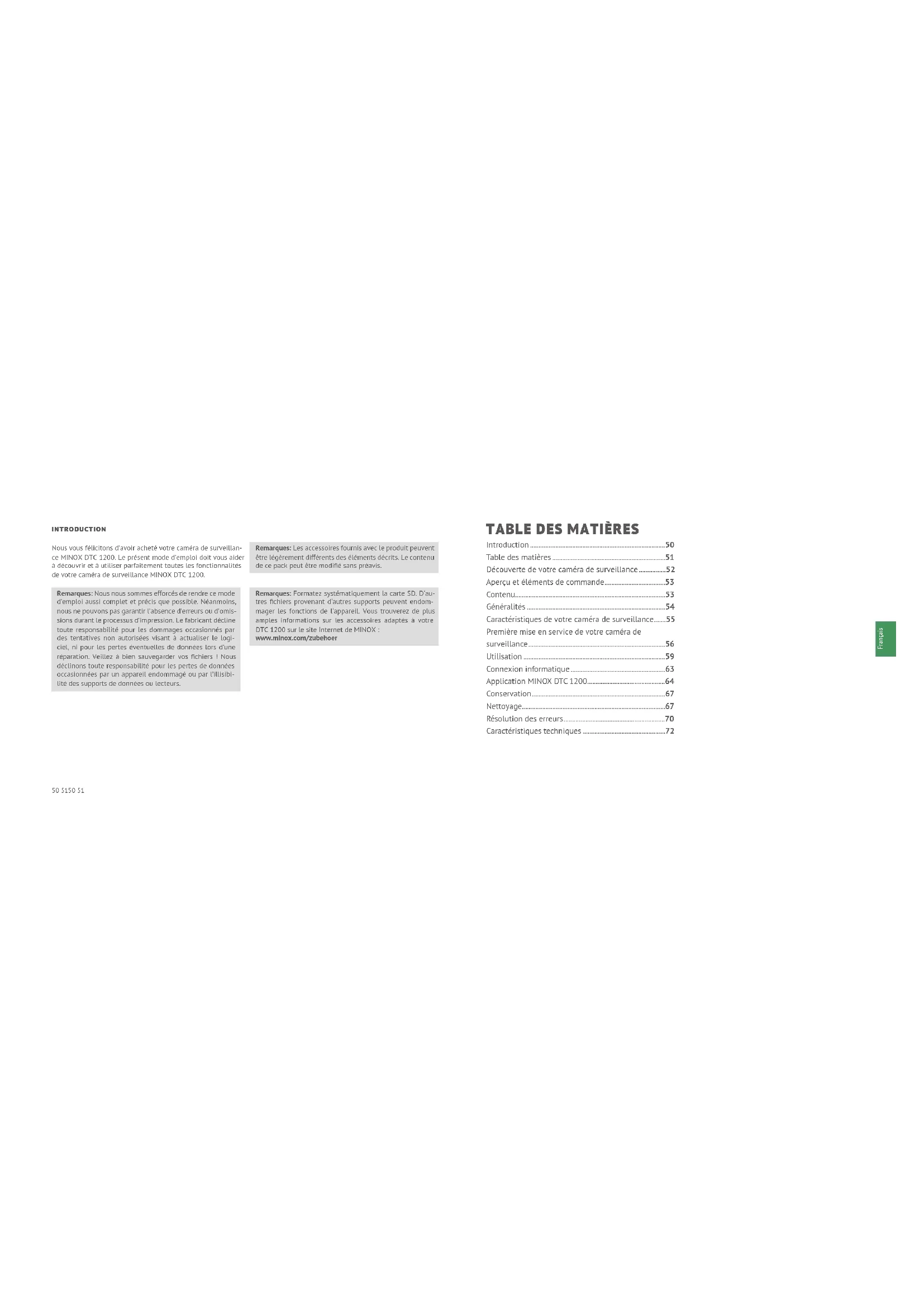 DE COMMANDE 1 | LEDs infrarouge 2 | Fermeture confort 3 | Objectif 4 | Capteur de mouvement 5 | Antenne 6 | Raccordement pour antenne 7 | Interrupteur de mode de fonctionnement 8 | Logement de carte SD 9 | Déverrouillage du logement des batteries 10 | Moniteur de contrôle couleur 2,0“ 11 | Touches de commande 12 | Raccordement 6 V CC 13 | Trou de verrouillage CONTENU Caméra de surveillance MINOX DTC 1200 Antenne radio 4G Courroie de fixation Micro-carte SD avec adaptateur Notice abrégée Consignes de sécurité Accessoires nécessaires, non contenus dans la livraison: 12 batteries de type LR6 (AA) 1,5 V ou accumulateurs NiMH équivalent Un smartphone ou une tablette Une connexion de données stable pour le téléchargement de l’application54 5554 55 Français