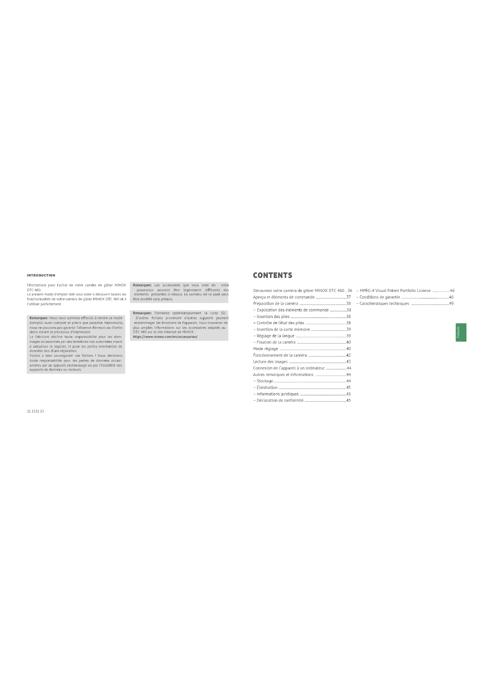 - – Caractéristiques techniques INTRODUCTION Félicitations pour l’achat de votre caméra de gibier MINOX DTC 460. Le présent mode d’emploi doit vous aider à découvrir toutes les fonctionnalités de votre caméra de gibier MINOX DTC 460 et à l’utiliser parfaitement. Remarques: Nous nous sommes eorcés à rendre ce mode d’emploi aussi complet et précis que possible. Néanmoins, nous ne pouvons pas garantir l’absence d’erreurs ou d’omis- sions durant le processus d’impression. Le fabricant décline toute responsabilité pour les dom- mages occasionnés par des tentatives non autorisées visant à actualiser le logiciel, ni pour les pertes éventuelles de données lors d’une réparation. Veillez à bien sauvegarder vos fichiers ! Nous déclinons toute responsabilité pour les pertes de données occasi- onnées par un appareil endommagé ou par l’illisibilité des supports de données ou lecteurs. Remarques: Les accessoires que vous avez en votre possession peuvent être légèrement diérents des éléments présentés ci-dessus. Le contenu de ce pack peut être modifié sans préavis. Remarques: Formatez systématiquement la carte SD. D‘autres fichiers provenant d‘autres supports peuvent endommager les fonctions de l‘appareil. Vous trouverez de plus amples informations sur les accessoires adaptés au DTC 460 sur le site Internet de MINOX : https://www.minox.com/en/accessories/34 3534 35 Français p. 49