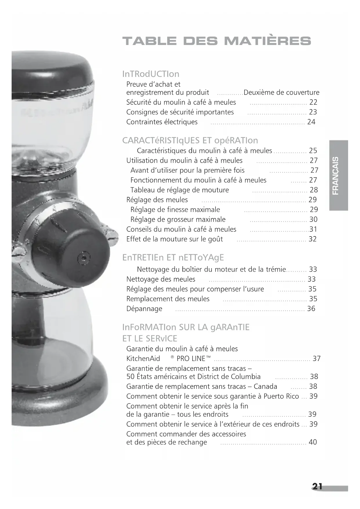 PRO LINE™ connaît une défaillance au cours des deux premières années suivant l’achat, KitchenAid fera les arrangements voulus pour livrer un remplacement identique ou comparable à votre porte sans frais et fera les arrangements voulus pour que votre moulin à café original nous soit retourné. Votre remplacement sera aussi couvert par notre garantie limitée de deux ans. Veuillez suivre ces instructions pour recevoir ce service de qualité. Si votre moulin à café connaît une défaillance au cours des deux premières années après l’achat, il vous suffit appeler le Centre de satisfaction de la clientèle au numéro sans frais suivant : 1-800-541-6390, du lundi au vendredi de 8 h à 20 h (heure de l’est), ou le samedi de 10 h à 17 h. Donnez au consultant votre adresse complète d’expédition. (Pas de numéro boîte postale, s.v.p.) Lorsque vous recevrez votre moulin à café de remplacement, utilisez le carton et les matériaux d’emballage pour emballer votre moulin à café original. Dans le carton, veuillez inclure votre nom et votre adresse sur une feuille de papier avec une copie de la preuve d’achat (facture, feuillet de carte de crédit, etc.). GaRantIE DE REMPLaCEMEnt sans tRaCas – CanaDa Nous sommes tellement certains que la qualité de nos produits répond aux normes strictes de KitchenAid que, si votre moulin à café connaît une défaillance au cours des deux premières années suivant l’achat, KitchenAid Canada remplacera votre moulin à café avec un produit de remplacement identique ou comparable. Votre remplacement sera aussi couvert par notre garantie limitée de deux ans. Veuillez suivre ces instructions pour recevoir ce service de qualité. Si votre moulin à café connaît une défaillance au cours des deux premières années après l’achat, apportez-le ou expédiez-le contre remboursement à un Centre de service autorisé de KitchenAid Canada. Dans le carton, veuillez inclure votre nom et votre adresse complète d’expédition en plus d’une copie de la preuve d’achat (facture, feuillet de carte de crédit, etc.). Nous couvrons les frais d’expéditions pour l’envoi de votre moulin à café de remplacement ainsi que l’assurance. Si vous êtes incapable d’obtenir un service satisfaisant de cette manière, veuillez appeler le numéro sans frais du Centre de relations avec la clientèle au 1-800-807-6777. Ou écrivez-nous à l’adresse suivante : Centre de relations avec la clientèle, KitchenAid Canada, 1901 Minnesota Court, Mississauga, ON L5N 3A7.39 FraNçaIS COMMEnt OBtEnIR LE sERvICE sOUs GaRantIE à PUERtO RICO Votre moulin à café est couvert par une garantie limitée de deux ans à partir de la date d’achat. KitchenAid paiera les pièces de rechange et les frais de main d’œuvre de réparation pour corriger les problèmes de matériaux et de main d’œuvre. Le service de réparation doit être effectué par un Centre de service autorisé KitchenAid. Apportez votre moulin à café ou expédiez-le à un Centre de service autorisé KitchenAid. Nous couvrons les frais d’expéditions pour l’envoi de votre moulin à café de remplacement ainsi que l’assurance. Si vous êtes incapable d’obtenir un service satisfaisant de cette manière, veuillez appeler le numéro sans frais 1-800-541-6390 pour connaître l’emplacement d’un Centre de service près de chez vous. COMMEnt OBtEnIR LE sERvICE aPRÈs La FIn DE La GaRantIE – tOUs LEs EnDROIts Avant d’appeler le service, veuillez consulter la section de dépannage de la page 36. Pour l’information de service dans les 50 états américains, le District de Columbia, et Puerto Rico, appelez le numéro sans frais 1-800-541-6390. Ou écrivez à l’adresse suivante : Centre de satisfaction de la clientèle, KitchenAid Portable Appliances, P.O. Box 218, St. Joseph, MI 49085-0218. Ou contactez un Centre de service autorisé près de chez vous. Pour l’information de service au Canada, appelez le numéro sans frais 1-800-807-6777. Ou écrivez-nous à l’adresse suivante : Centre de relations avec la clientèle, KitchenAid Canada, 1901 Minnesota Court, Mississauga, ON L5N 3A7. COMMEnt OBtEnIR LE sERvICE à L’ExtéRIEUR DE CEs EnDROIts Consultez votre détaillant local KitchenAid ou le magasin où vous avez acheté le moulin à café KitchenAid