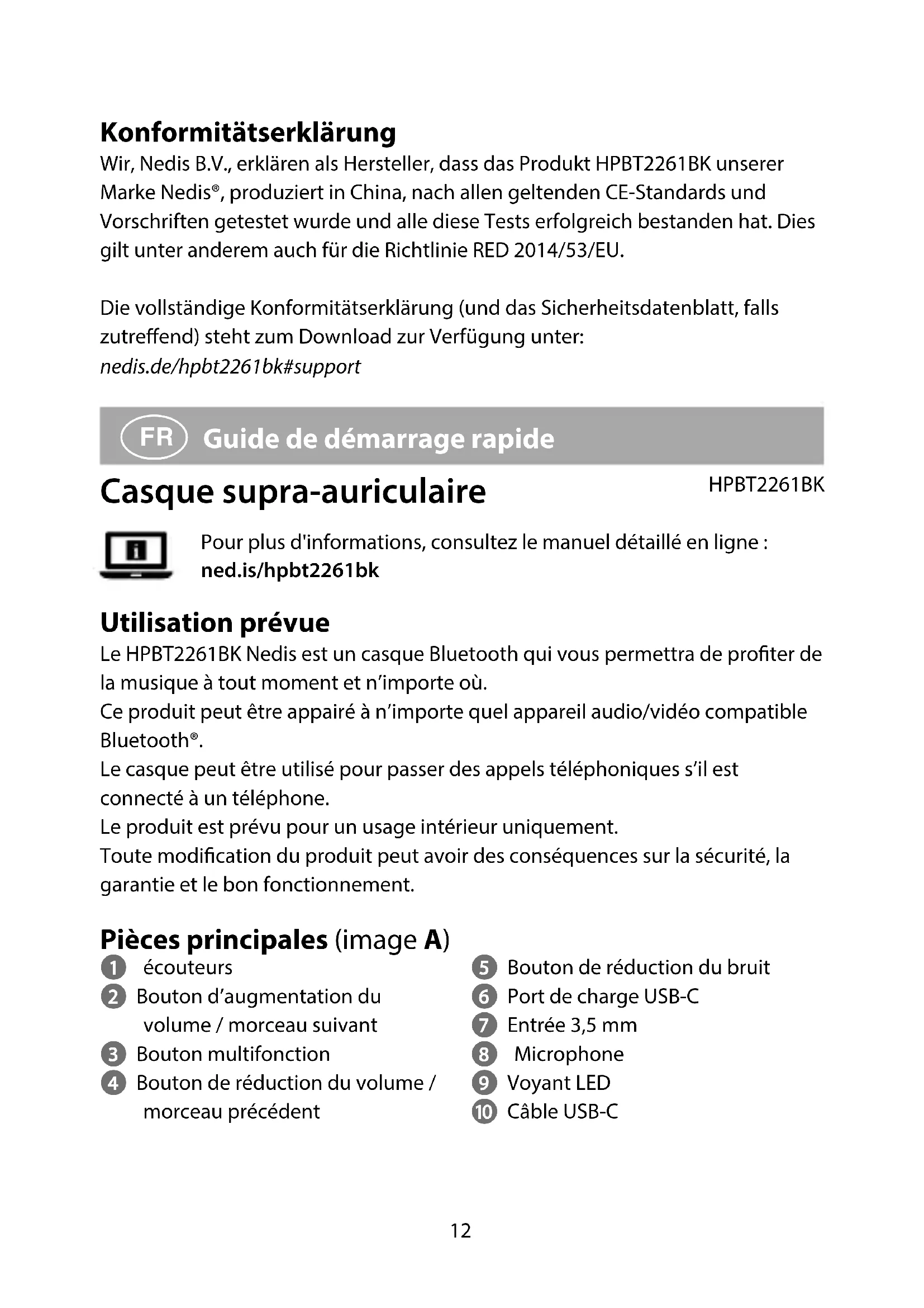 Guide de démarrage rapide Casque supra-auriculaire HPBT2261BK Pour plus d'informations, consultez le manuel détaillé en ligne : ned.is/hpbt2261bk Utilisation prévue Le HPBT2261BK Nedis est un casque Bluetooth qui vous permettra de proter de la musique à tout moment et n’importe où. Ce produit peut être appairé à n’importe quel appareil audio/vidéo compatible Bluetooth®. Le casque peut être utilisé pour passer des appels téléphoniques s’il est connecté à un téléphone. Le produit est prévu pour un usage intérieur uniquement. Toute modication du produit peut avoir des conséquences sur la sécurité, la garantie et le bon fonctionnement. Pièces principales (image A) 1 écouteurs 2 Bouton d’augmentation du volume / morceau suivant 3 Bouton multifonction 4 Bouton de réduction du volume / morceau précédent 5 Bouton de réduction du bruit 6 Port de charge USB-C 7 Entrée 3,5 mm 8 Microphone 9 Voyant LED q Câble USB-C13 Consignes de sécurité Icône Description Indication expliquant que le produit peut causer des dommages auditifs. Ne pas écouter à un volume élevé pendant de longues périodes.