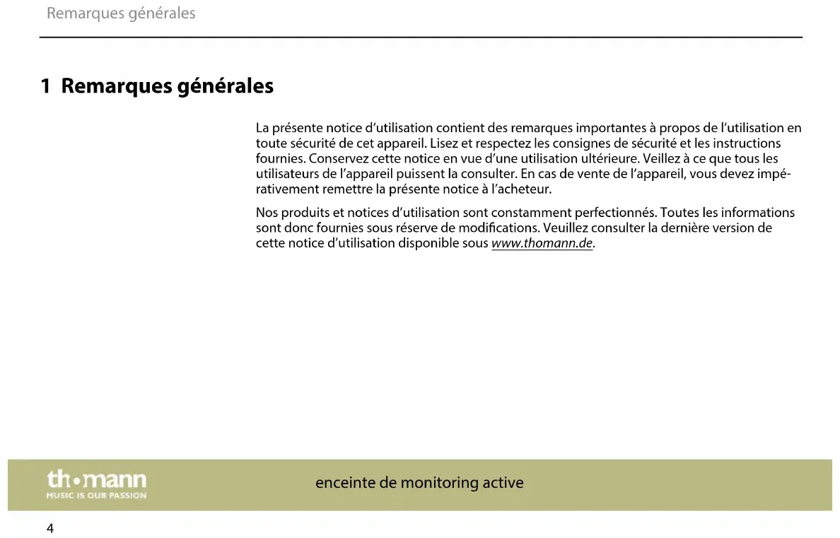 Sur notre site (www.thomann.de) vous trouverez beaucoup plus d'informations et de détails sur les points suivants : Téléchargement Cette notice d'utilisation est également disponible sous forme de chier PDF à télécharger. Recherche par mot-clé Utilisez dans la version électronique la fonction de recherche pour trouver rapidement les sujets qui vous intéressent. Guides en ligne Nos guides en ligne fournissent des informations détaillées sur les bases et termes techniques. Conseils personnalisés Pour obtenir des conseils, veuillez contacter notre hotline technique. Service Si vous avez des problèmes avec l'appareil, notre service clients sera heureux de vous aider. Remarques générales