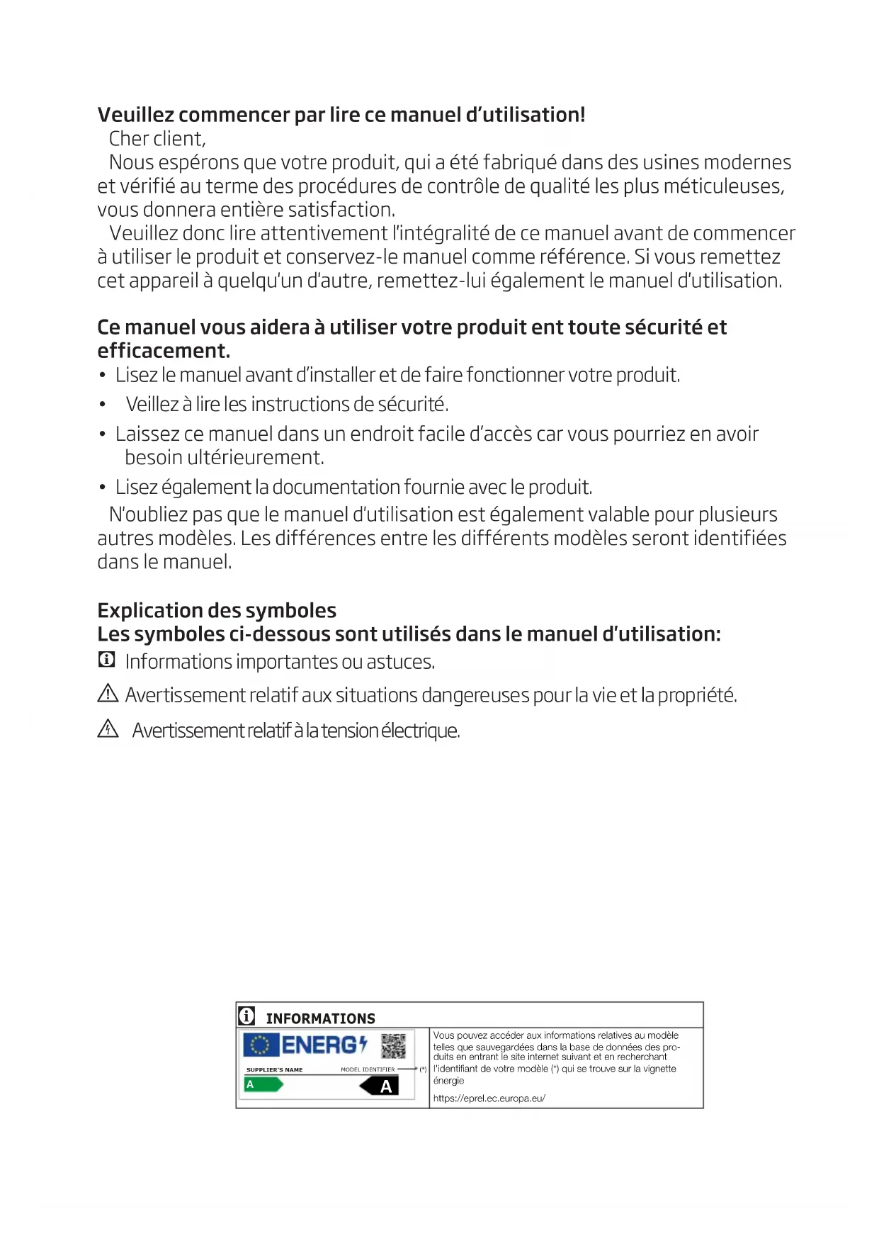 - Lisez le manuel avant d’installer et de faire fonctionner votre produit.