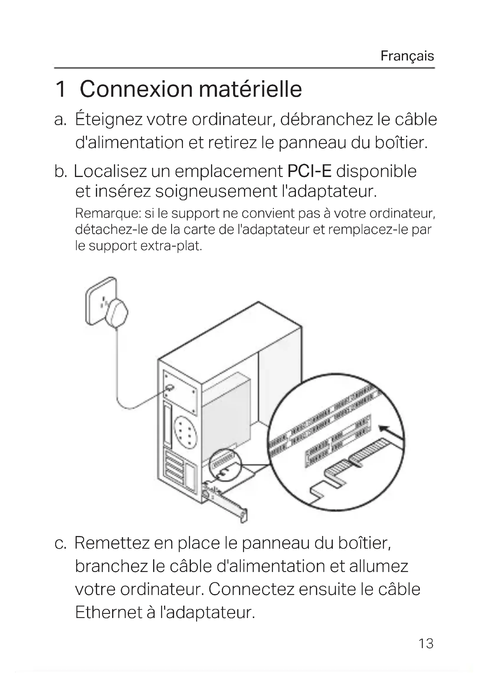 1 Connexion matérielle a. Éteignez votre ordinateur, débranchez le câble d'alimentation et retirez le panneau du boîtier. b. Localisez un emplacement PCI-E disponible et insérez soigneusement l'adaptateur. Remarque: si le support ne convient pas à votre ordinateur, détachez-le de la carte de l'adaptateur et remplacez-le par le support extra-plat. c. Remettez en place le panneau du boîtier, branchez le câble d'alimentation et allumez votre ordinateur. Connectez ensuite le câble Ethernet à l'adaptateur.Français