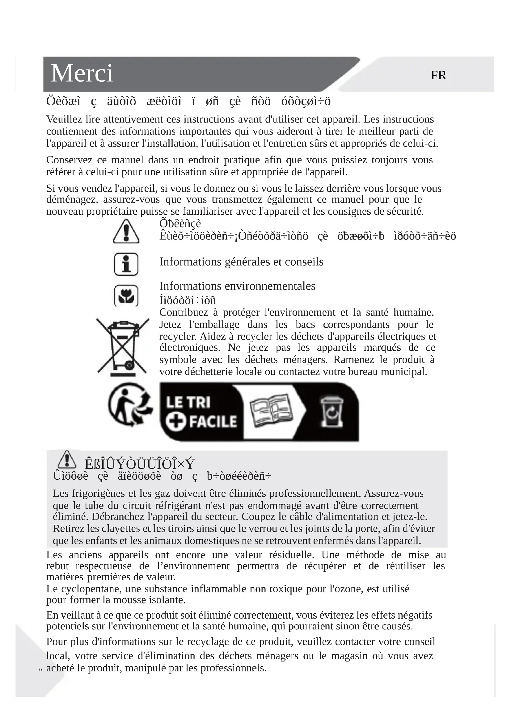 "Merci ÖèõæìçäùòìäǙǙǙè÷øǙǙñǙǙòçøì÷ìèǙǙǙǙ Veuillez lire attentivement ces instructions avant d'utiliser cet appareil. Les instructions contiennent des informations importantes qui vous aideront à tirer le meilleur parti de l'appareil et à assurer l'installation, l'utilisation et l'entretien sûrs et appropriés de celui-ci.Conservez ce manuel dans un endroit pratique afin que vous puissiez toujours vous référer à celui-ci pour une utilisation sûre et appropriée de l'appareil. Si vous vendez l'appareil, si vous le donnez ou si vous le laissez derrière vous lorsque vous déménagez, assurez-vous que vous transmettez également ce manuel pour que le nouveau propriétaire puisse se familiariser avec l'appareil et les consignes de sécurité. ÕèèǙñçè Êùèõ÷ìööèðèñ÷ ¡ Òñéòõðä÷ìòñö ìǙ óò÷Ǚäñ÷èö öøõ ïä öƀæøìǙ÷ƀ Informations générales et conseils Informations environnementales ÖìöèäøèǙǙø÷ Contribuez à protéger l'environnement et la santé humaine. Jetez l'emballage dans les bacs correspondants pour le recycler. Aidez à recycler les déchets d'appareils électriques et électroniques. Ne jetez pas les appareils marqués de ce symbole avec les déchets ménagers. Ramenez le produit à votre déchetterie locale ou contactez votre bureau municipal. ÊßÎÛÝÒÜÜÎÖÎ×Ý öøèçǙǙǙèïǙèööøèòøçèǙöøòǙǙǙä÷ìòñ Les frigorigènes et les gaz doivent être éliminés professionnellement. Assurez-vous que le tube du circuit réfrigérant n'est pas endommagé avant d'être correctement éliminé. Débranchez l'appareil du secteur. Coupez le câble d'alimentation et jetez-le. Retirez les clayettes et les tiroirs ainsi que le verrou et les joints de la porte, afin d'éviter que les enfants et les animaux domestiques ne se retrouvent enfermés dans l'appareil. Les anciens appareils ont encore une valeur résiduelle. Une méthode de mise au rebutrespectueuse de l’environnement permettra de récupérer et de réutiliser les matières premières de valeur.Le cyclopentane, une substance inflammable non toxique pour l'ozone, est utilisé pourformer la mousse isolante.En veillant à ce que ce produit soit éliminé correctement, vous éviterez les effets négatifs potentiels sur l'environnement et la santé humaine, qui pourraient sinon être causés. Pour plus d'informations sur le recyclage de ce produit, veuillez contacter votre conseil local, votre service d'élimination des déchets ménagers ou le magasin où vous avezacheté le produit, manipulé par les professionnels.Informations sur la sécurité