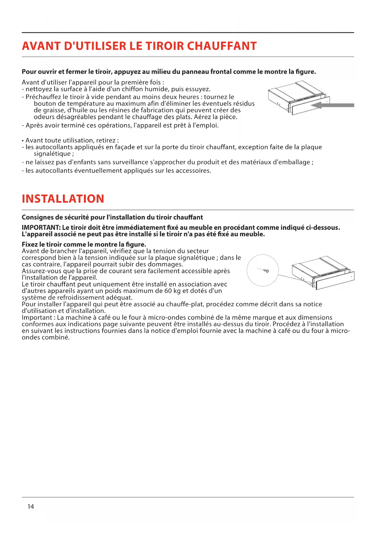 - Avant toute utilisation, retirez : - les autocollants appliqués en façade et sur la porte du tiroir chauffant, exception faite de la plaque signalétique; - ne laissez pas d'enfants sans surveillance s'approcher du produit et des matériaux d'emballage; - les autocollants éventuellement appliqués sur les accessoires. INSTALLATION Consignes de sécurité pour l'installation du tiroir chauant IMPORTANT: Le tiroir doit être immédiatement xé au meuble en procédant comme indiqué ci-dessous. L'appareil associé ne peut pas être installé si le tiroir n'a pas été xé au meuble. Fixez le tiroir comme le montre la gure. Avant de brancher l'appareil, vérifiez que la tension du secteur correspond bien à la tension indiquée sur la plaque signalétique; dans le cas contraire, l'appareil pourrait subir des dommages. Assurez-vous que la prise de courant sera facilement accessible après l'installation de l'appareil. Le tiroir chauffant peut uniquement être installé en association avec d'autres appareils ayant un poids maximum de 60 kg et dotés d'un système de refroidissement adéquat. Pour installer l'appareil qui peut être associé au chauffe-plat, procédez comme décrit dans sa notice d'utilisation et d'installation. Important: La machine à café ou le four à micro-ondes combiné de la même marque et aux dimensions conformes aux indications page suivante peuvent être installés au-dessus du tiroir. Procédez à l'installation en suivant les instructions fournies dans la notice d'emploi fournie avec la machine à café ou du four à micro- ondes combiné.FR
