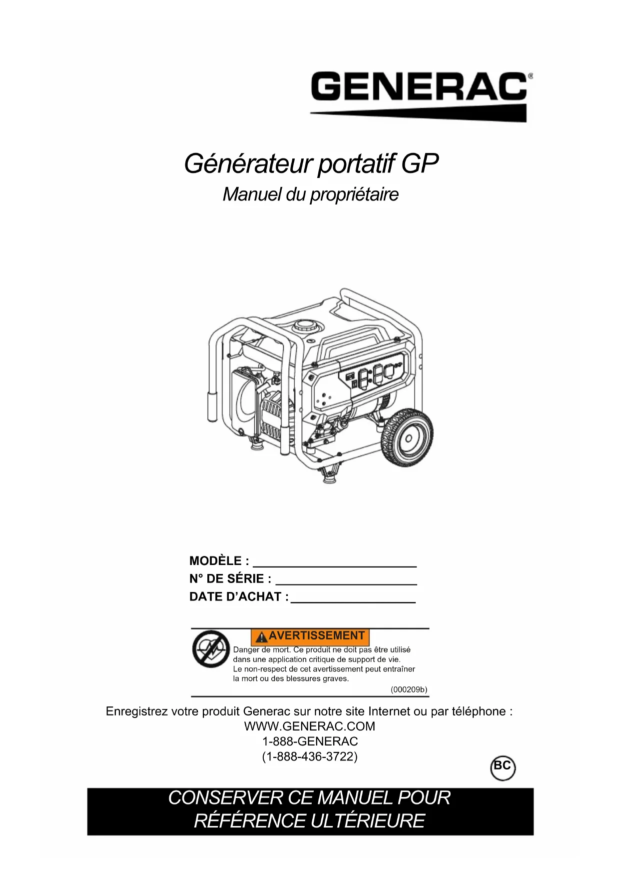 l’indicateur jaune clignotant en cas d’arrêt du générateur. Si le problème persiste et que le module COsense s’éteint, contactez un IASD. DE BATTERIE RAISON CORRECTIONManuel du propriétaire de générateur portatif 25 Schéma de câblage 010106Réf. 10000029705 Rev. C 04/09/2020 ©2020 Generac Power Systems, Inc. Tous droits réservés Les spécifications sont sujettes à modification sans préavis. Aucune forme de reproduction n’est autorisée sans le consentement écrit préalable de Generac Power Systems, Inc. Generac Power Systems, Inc. S45 W29290 Hwy. 59 Waukesha, WI 53189 1-888-GENERAC (1-888-436-3722) www.generac.com