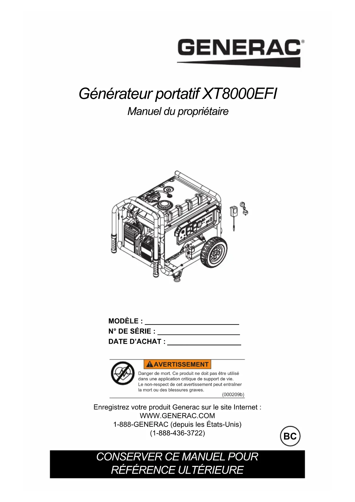 XT8000EFI - Générateur Generac - Notice d'utilisation et mode d'emploi gratuit