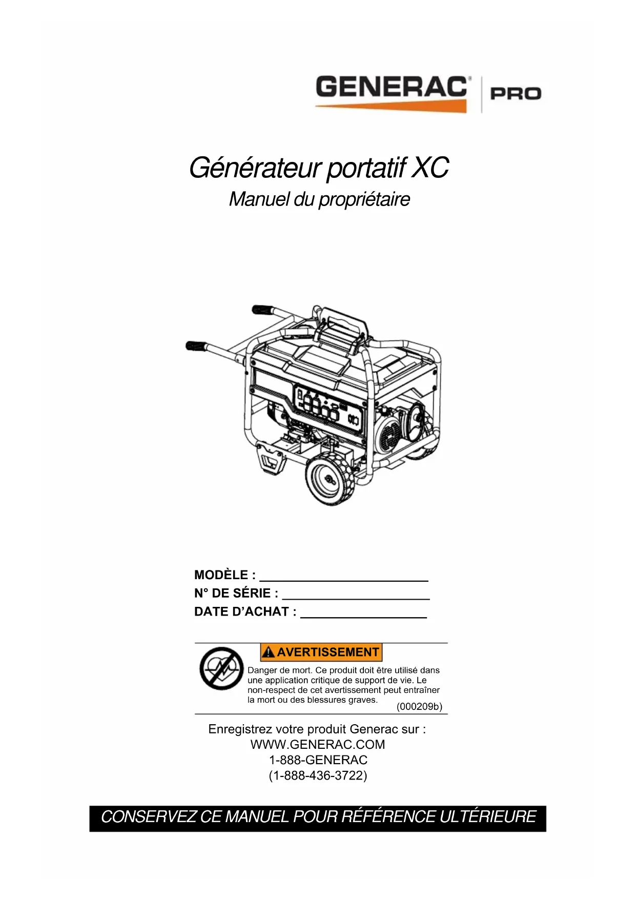 PROBLÈME CAUSE CORRECTION23 Manuel du propriétaire de générateur portatif RemarquesManuel du propriétaire de générateur portatif 24 RemarquesManuel du propriétaire de générateur portatif 25Pièce n° 10000004327 Rév. B 14/05/2018 ©2018 Generac Power Systems, Inc. Tous droits réservés Les spécifications sont sujettes à modification sans préavis. Aucune forme de reproduction n’est autorisée sans le consentement écrit préalable de Generac Power Systems Inc. Generac Power Systems, Inc. S45 W29290 Hwy. 59 Waukesha, WI 53189 1-888-GENERAC (1-888-436-3722) www.generac.com/pro