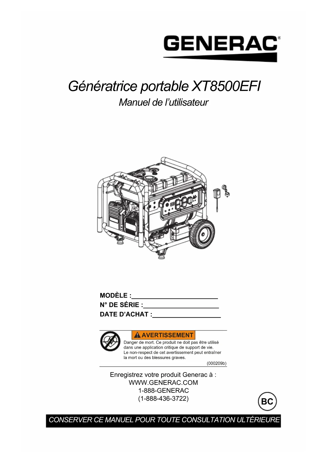 XT8500EFI - Générateur Generac - Notice d'utilisation et mode d'emploi gratuit