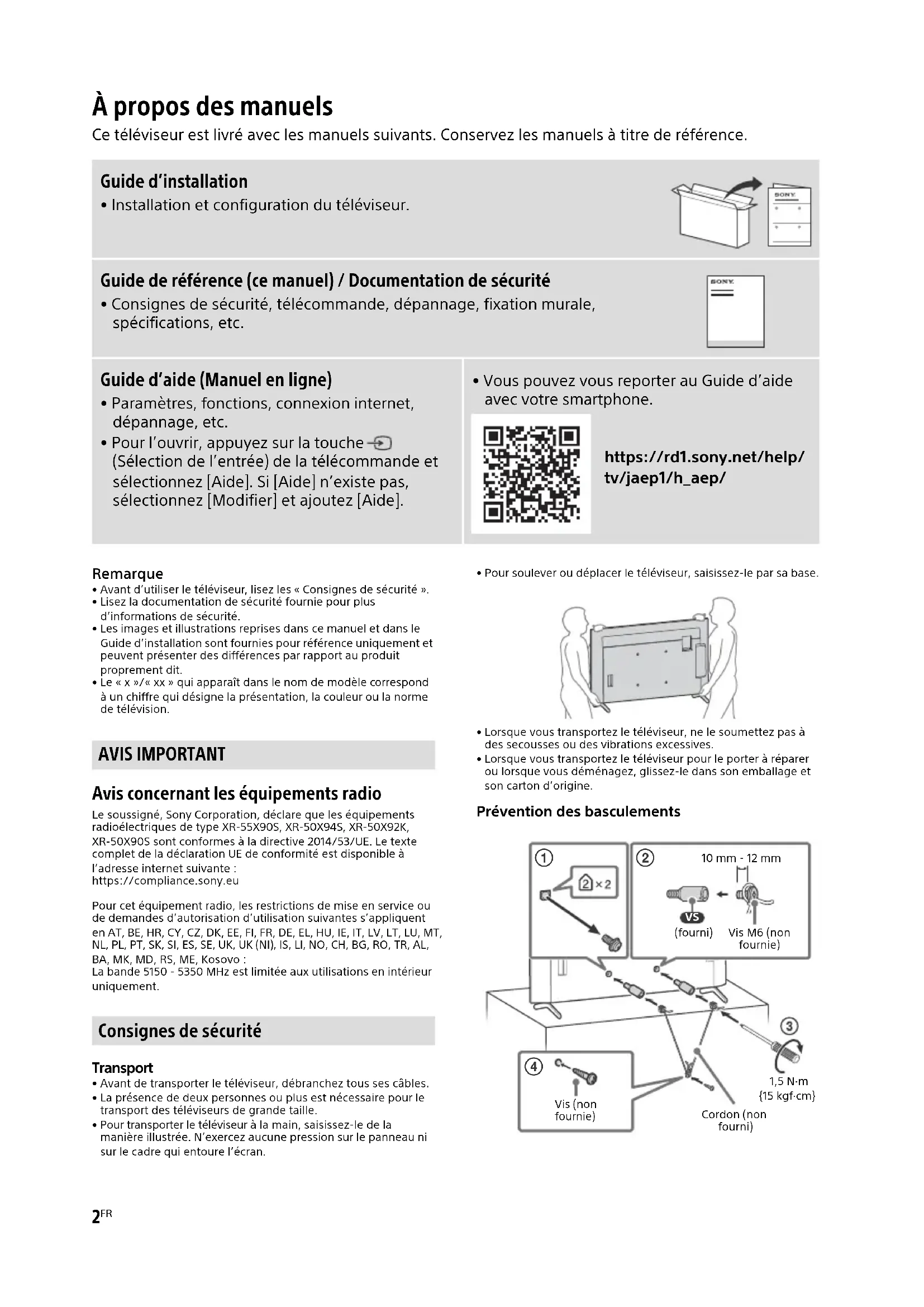 - Vous pouvez vous reporter au Guide d’aide avec votre smartphone. https://rd1.sony.net/help/ tv/jaep1/h_aep/ AVIS IMPORTANT Consignes de sécurité