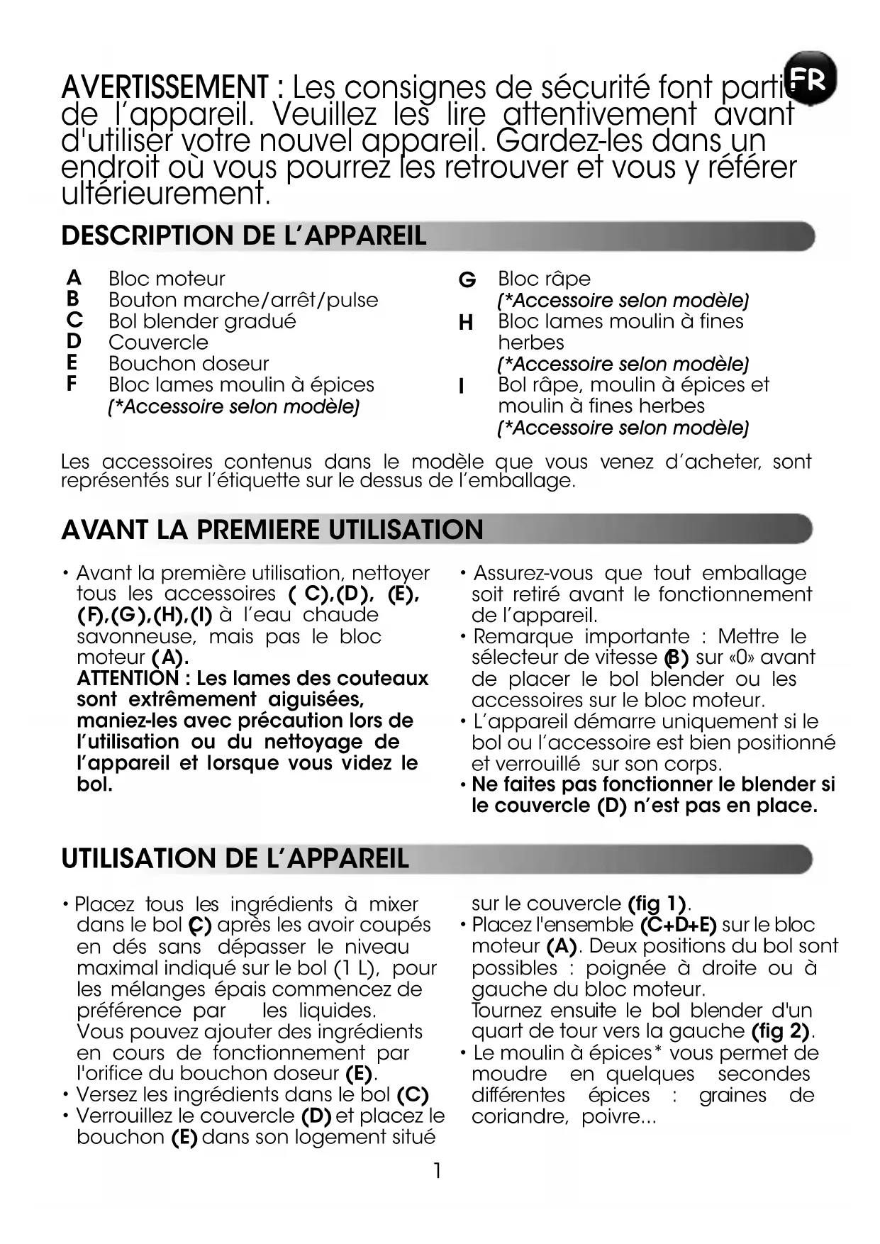 - Manipulez-les avec précaution, les lames du bol blender et des accessoires sont coupantes.