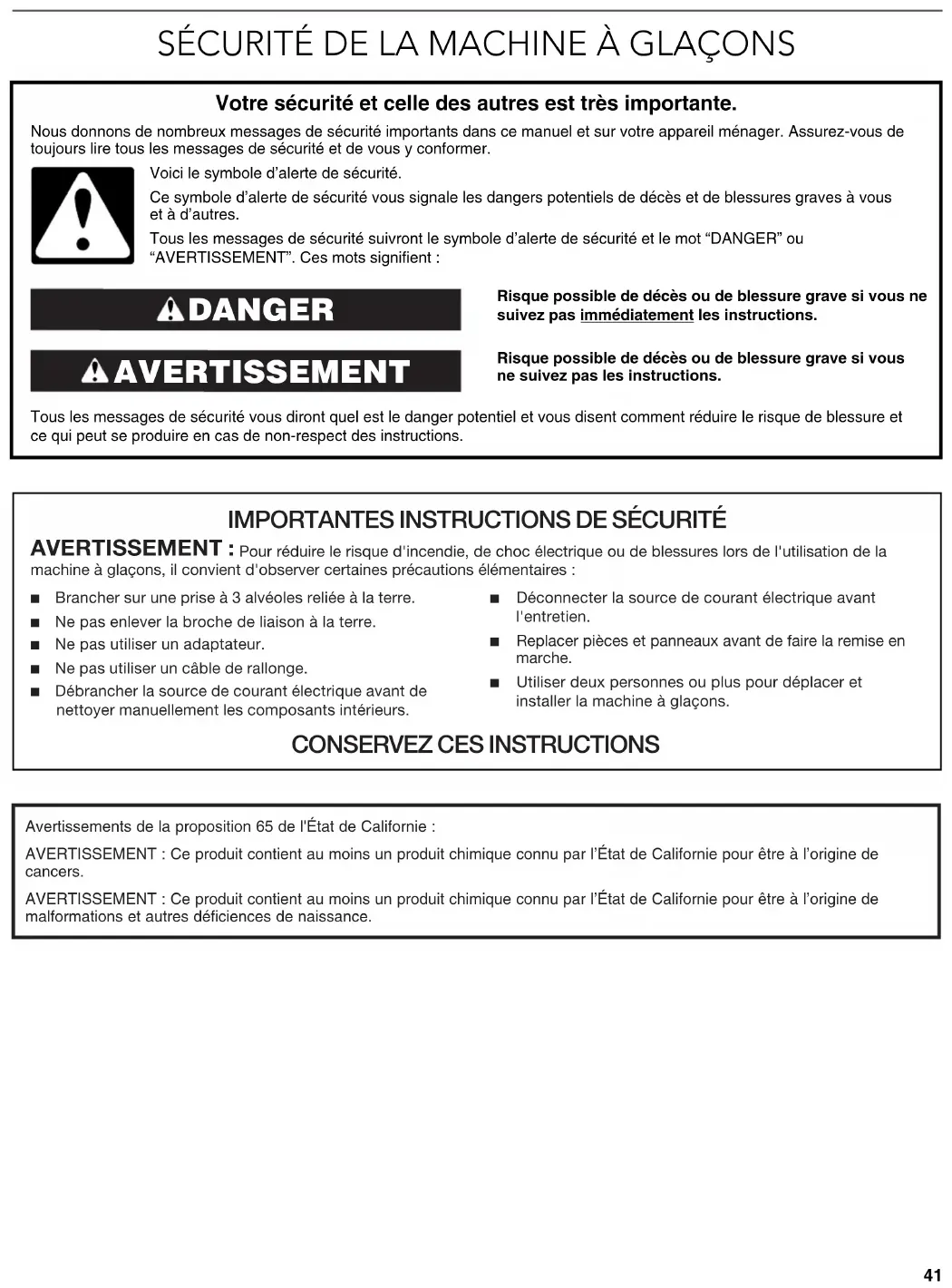 ■ Brancher sur une prise à 3 alvéoles reliée à la terre. ■ Ne pas enlever la broche de liaison à la terre. ■ Ne pas utiliser un adaptateur. ■ Ne pas utiliser un câble de rallonge. ■ Débrancher la source de courant électrique avant de nettoyer manuellement les composants intérieurs. ■ Déconnecter la source de courant électrique avant l'entretien. ■ Replacer pièces et panneaux avant de faire la remise en marche. ■ Utiliser deux personnes ou plus pour déplacer et installer la machine à glaçons. Avertissements de la proposition 65 de l'État de Californie :