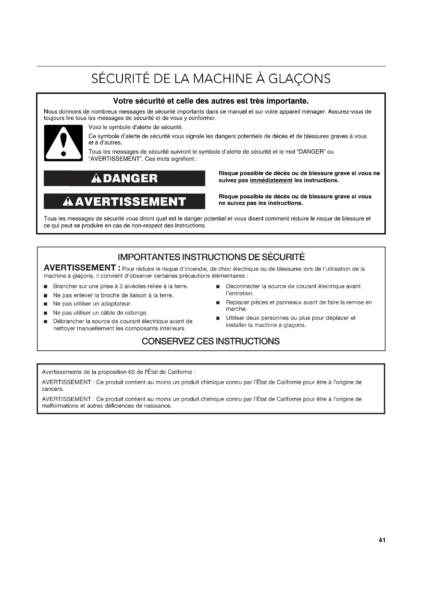 ■ Brancher sur une prise à 3 alvéoles reliée à la terre. ■ Ne pas enlever la broche de liaison à la terre. ■ Ne pas utiliser un adaptateur. ■ Ne pas utiliser un câble de rallonge. ■ Débrancher la source de courant électrique avant de nettoyer manuellement les composants intérieurs. ■ Déconnecter la source de courant électrique avant l'entretien. ■ Replacer pièces et panneaux avant de faire la remise en marche. ■ Utiliser deux personnes ou plus pour déplacer et installer la machine à glaçons. Avertissements de la proposition 65 de l'État de Californie :