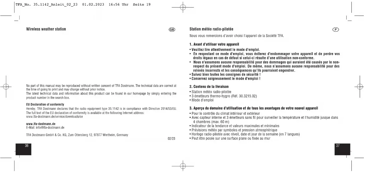 - Nous vous recommandons de respecter une distance de 1,5 - 2 m entre l'appareil et d’éventuelles sources de signaux parasites, comme les écrans d'ordinateurs et les postes de télévision. TFA_No. 35.1142_Anleit_02_23 01.02.2023 16:56 Uhr Seite 224544 Station météo radio-pilotée