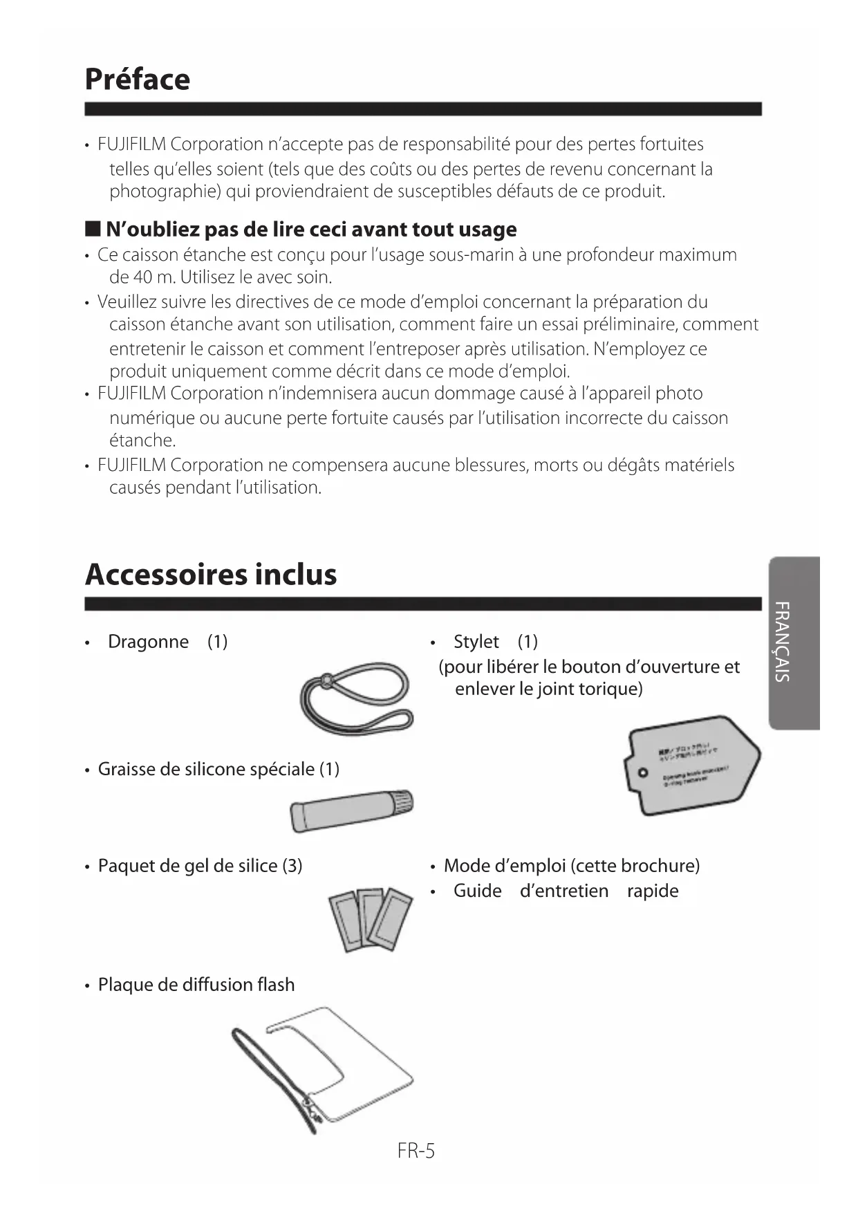- Special silicone grease (SGR-01) Special silicone grease for O-ring maintenance (Special silicone grease × 1[approx. 3 g / 0.1 oz]) 00F500Wcase.indb2700F500Wcase.indb27 2011/02/1815:57:102011/02/1815:57:10FR-2 Notes pour la sécurité Merci d’avoir choisi un de nos produits. Avant d’employer le produit, n’oubliez pas de lire le “Mode d’emploi”, et en particulier les “Notes pour la sécurité”, aussi bien que le “Mode d’emploi” de l’appareil photo numérique. Après les avoir lus, gardez-les à proximité afin de pouvoir les consulter facilement à tout moment. AVERTISSEMENT Ne le démontez pas. N’essayez jamais de modifier ou de démonter l’appareil photo. Cela risque de causer des fuites d’eau. Ne mettez pas l’appareil photo sur une surface inclinée ou mobile. Cela risque de faire tomber ou de casser l’appareil et également cela risquerait de causer des blessures ou des dégâts. N’utilisez que la batterie indiquée pour l’appareil photo. L’utilisation d’autres sources d’énergie peut causer un incendie. N’utilisez que la batterie indiquée. Chargez la batterie en respectant la marche à suivre de l’indicateur. Ne chauffez pas, ne modifiez pas et n’essayez pas de démonter la batterie. Ne laissez pas tomber ou ne soumettez la batterie à aucun impact. Ne court-circuitez pas la batterie. Ne stockez pas la batterie à côté de produits métalliques. N’employez pas de chargeur autre que le modèle indiqué pour charger la batterie. La non conformité aux instructions ci-dessus risque de provoquer l’éclatement de la batterie, ainsi que des fuites, du feu ou des blessures. ■ Dans ce document, les icônes montrées ci-dessous sont employées pour indiquer la sévérité des blessures ou des dommages qui peuvent résulter si l’information indiquée par l’icône est ignorée ou si le produit est manipulé de façon incorrecte. AVERTISSEMENT Cette icône indique que des blessures graves peuvent se produire si l’information est ignorée. ATTENTION Cette icône indique que l’on risque d’être blessé ou de provoquer des dommages matériels si l’information est ignorée.