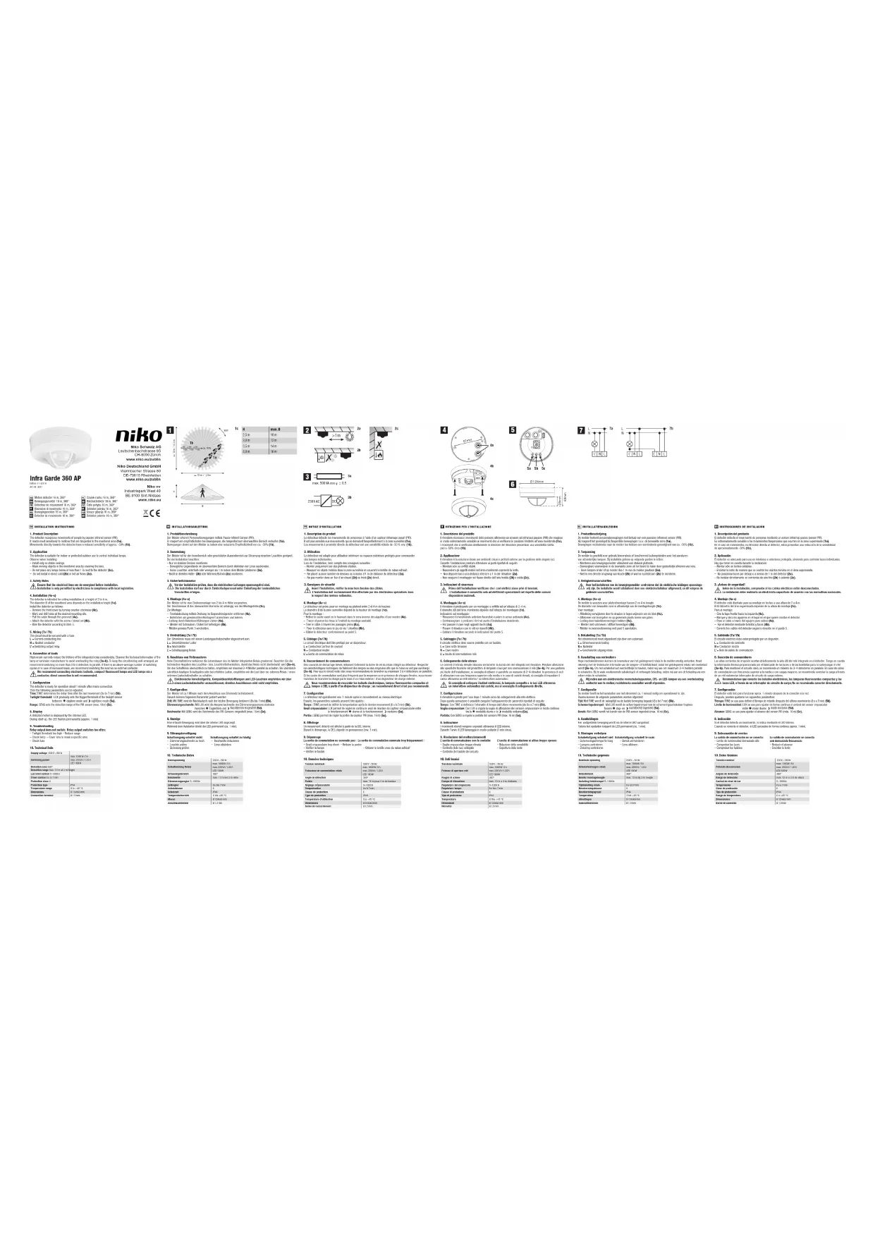 Vor der Installation prüfen, dass die elektrischen Leitungen spannungsfrei sind. Die Installation darf nur durch Elektrofachpersonal unter Einhaltung der landesüblichen Vorschriften erfolgen.4. Montage (4a–c)Der Melder ist für eine Deckenmontage von 2 bis 4 m Höhe vorgesehen. Der Durchmesser Ø des überwachten Bereichs ist abhängig von der Montagehöhe (1c).Zur Montage:– Frontabdeckung mittels Drehung im Gegenuhrzeigersinn entfernen (4c).– Bohrlöcher am gewünschten Montageort anzeichnen und bohren.– Leitung durch Kabeldurchführungen ziehen (4a).– Melder mit Schrauben / Dübel Set befestigen (4b).– Melder gemäss Punkt 5 verdrahten.5. Verdrahtung (7a / 7b)Der Stromkreis muss mit einem Leistungsschutzschalter abgesichert sein. L = Stromführender LeiterN = NeutralleiterL’ = Schaltausgang Relais6. Anschluss von VerbrauchernHohe Einschaltströme verkürzen die Lebendsauer des im Melder integrierten Relais gravierend. Beachten Sie die technischen Angaben des Leuchten- bzw. Leuchtmittelherstellers, damit das Relais nicht überbelastet wird (3a–b). Um den Schaltkreis übersichtlich zu halten, empfehlen wir maximal 3–4 Melder parallel zu schalten. Bei überdurch-schnittlich häufigen Schaltzyklen oder bei erhöhten Lasten, empfehlen wir die Last über ein externes Relais / einen externen Lastschutzschalter zu schalten. Elektronische Vorschaltgeräte, Kompaktleuchtstofflampen und LED-Leuchten empfehlen wir über einen Lastschutzschalter anzuschliessen; direktes Anschliessen wird nicht empfohlen.7. KonfigurationDer Melder ist ca.1 Minute nach dem Anschluss ans Stromnetz betriebsbereit. Danach können folgenden Parameter justiert werden: Zeit: Mit TIME wird die Nachlaufzeit nach der letzten Bewegung bestimmt (8 s bis 7 min) (5b). Dämmerungsschwelle: Mit LUX wird die Ansprechschwelle des Dämmerungssensors stufenlos zwischen Z Tagbetrieb und Nachtberieb eingestellt (5a). Reichweite: Mit SENS wird die Reichweite des PIR-Sensors eingestellt (max. 16 m) (5c). 8. AnzeigeEine erfasste Bewegung wird über die interne LED angezeigt. Während dem Aufstarten blinkt die LED permanent (ca. 1 min).9. StörungsbeseitigungSchaltausgang schaltet nicht: Schaltausgang schaltet zu häufig:– Dämmerungsschwelle zu hoch – Reichweite reduzieren– Leuchte prüfen – Linse abkleben– Sicherung prüfen10. Technische DatenNennspannung 230 V ~ 50 HzSchaltleistung Relaismax. 1000 W / 5 Amax. 250 VA / 1.25 ALED 100 WErfassungsbereich 360°Reichweite max. 12 m bei 3 m HöheDämmerungsregler 5–1000 lx Zeitregler 8 s bis 7 min Schutzklasse IISchutzart IP44Temperaturbereich 0 bis +45 °CMasse Ø 124x63 mmAnschlussklemme Ø 1,5 mm NOTICE D’INSTALLATION1. Description du produitLe détecteur détecte les mouvements de personnes à l’aide d’un capteur infrarouge passif (PIR). Il est plus sensible aux mouvements qui se déroulent tangentiellement à la zone surveillée (1a). Les mouvements à proximité directe du détecteur ont une sensibilité réduite de -50 % env. (1b).2. UtilisationLe détecteur est adapté pour utilisation intérieure ou espaces extérieurs protégés pour commander des lampes individuelles. Lors de l’installation, tenir compte des consignes suivantes :– Monter uniquement sur des plafonds stables.– Masquer les objets mobiles dans la zone surveillée en couvrant la lentille de ruban adhésif.– Ne placer aucune lumière en dessous ou à moins d’1 m de distance du détecteur (2a).– Ne pas monter dans un flux d’air chaud (2b) ou froid (2c) direct.3. Consignes de sécurité Avant l’installation, vérifier la mise hors tension des câbles. L’installation doit exclusivement être effectuée par des électriciens spécialisés dans le respect des normes nationales.4. Montage (4a–c)Le détecteur est prévu pour un montage au plafond entre 2 et 4 m de hauteur. Le diamètre Ø de la zone surveillée dépend de la hauteur de montage (1c).Pour le montage :– Retirer le cache avant en le tournant dans le sens inverse des aiguilles d’une montre (4c).– Tracer et percer les trous à l’endroit du montage souhaité.– Tirer le câble à travers les passages prévu (4a).– Fixer le détecteur avec le jeu de vis / chevilles (4b).– Câbler le détecteur conformément au point 5.5. Câblage (7a / 7b)Le circuit électrique doit être protégé par un disjoncteur. L = Conducteur porteur de courantN = Conducteur neutreL’ = Sortie de commutation de relais6. Raccordement de consommateursDes courants de démarrage élevés réduisent fortement la durée de vie du relais intégré au détecteur. Respecter les caractéristiques techniques du fabricant des lampes ou des ampoules afin que le relais ne soit pas surchargé (3a–b). Pour que le circuit reste clair, nous recommandons de brancher au maximum 3 à 4 détecteurs en parallèle. Si les cycles de commutation sont plus fréquents que la moyenne ou en présence de charges élevées, nous recom-mandons de brancher la charge par le biais d’un relais externe / d’un disjoncteur de charge externe. Nous recommandons de raccorder les ballasts électroniques, lampes fluorescentes compactes et lampes à DEL à partir d’un disjoncteur de charge ; un raccordement direct n’est pas recommandé.7. ConfigurationLe détecteur est opérationnel env. 1 minute après le raccordement au réseau électrique. Ensuite, les paramètres suivants peuvent être ajustés : Temps : TIME permet de définir la temporisation après le dernier mouvement (8 s à 7 min) (5b). Seuil crépusculaire: LUX permet de régler en continu le seuil de réaction du capteur crépusculaire entre le fonctionnement Z diurne et le fonctionnement nocturne (5a). Portée : SENS permet de régler la portée du capteur PIR (max. 16 m) (5c). 8. AffichageUn mouvement détecté est affiché à partir de la DEL interne. Durant le démarrage, la DEL clignote en permanence (env. 1 min).9. DépannageLa sortie de commutation ne commute pas : La sortie de commutation comm