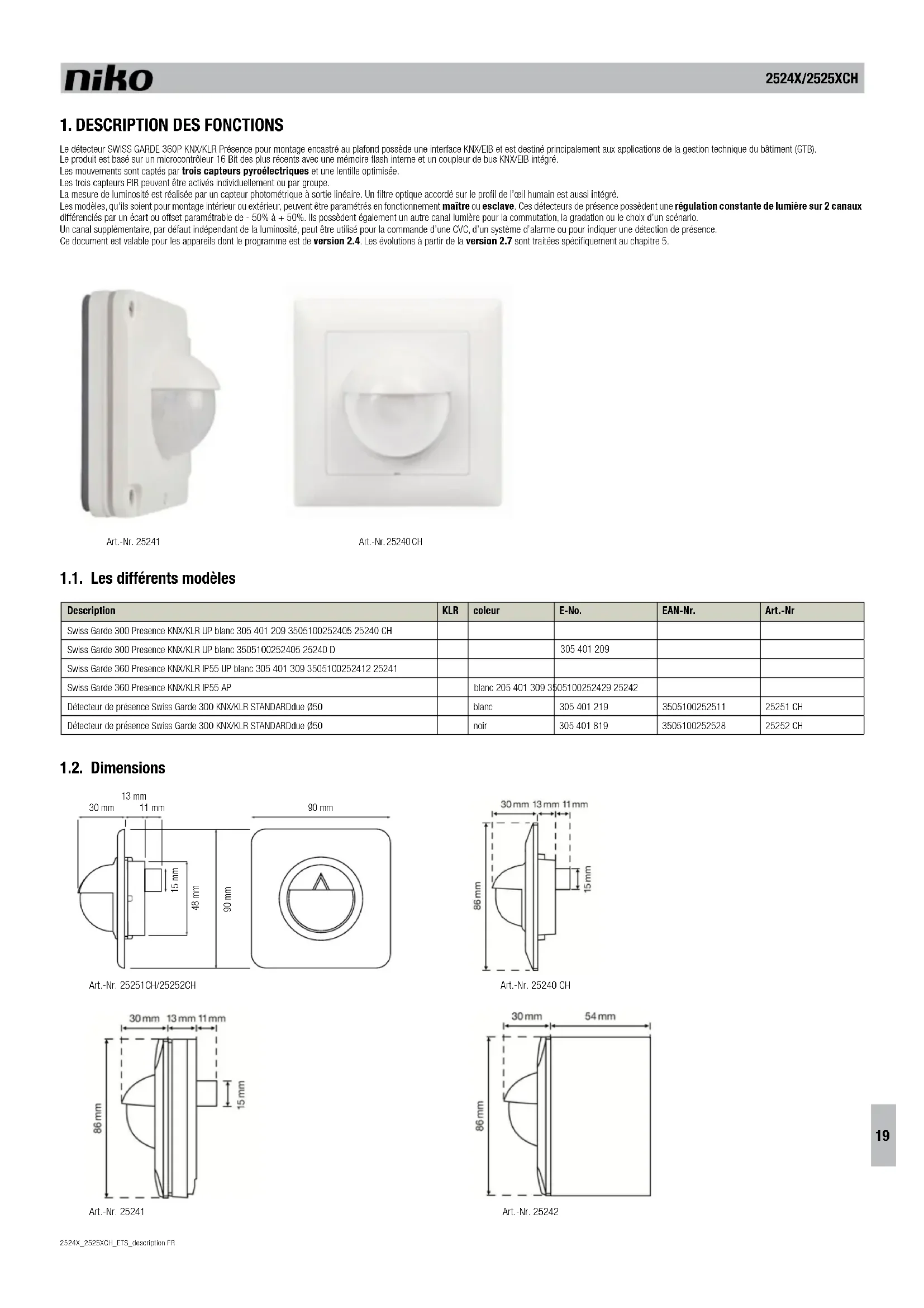 Le détecteur SWISS GARDE 360P KNX/KLR Présence pour montage encastré au plafond possède une interface KNX/EIB et est destiné principalement aux applications de la gestion technique du bâtiment (GTB). Le produit est basé sur un microcontrôleur 16 Bit des plus récents avec une mémoire flash interne et un coupleur de bus KNX/EIB intégré. Les mouvements sont captés par trois capteurs pyroélectriques et une lentille optimisée. Les trois capteurs PIR peuvent être activés individuellement ou par groupe. La mesure de luminosité est réalisée par un capteur photométrique à sortie linéaire. Un filtre optique accordé sur le profil de l’œil humain est aussi intégré. Les modèles, qu’ils soient pour montage intérieur ou extérieur, peuvent être paramétrés en fonctionnement maître ou esclave. Ces détecteurs de présence possèdent une régulation constante de lumière sur 2 canaux différenciés par un écart ou offset paramétrable de - 50% à + 50%. Ils possèdent également un autre canal lumière pour la commutation, la gradation ou le choix d’un scénario. Un canal supplémentaire, par défaut indépendant de la luminosité, peut être utilisé pour la commande d’une CVC, d’un système d’alarme ou pour indiquer une détection de présence. Ce document est valable pour les appareils dont le programme est de version 2.4. Les évolutions à partir de la version 2.7 sont traitées spécifiquement au chapitre 5. Art.-Nr. 25241 Art.-Nr. 25240 CH 1.1. Les différents modèles Description KLR coleur E-No. EAN-Nr. Art.-Nr Swiss Garde 300 Presence KNX/KLR UP blanc 305 401 209 3505100252405 25240 CH Swiss Garde 300 Presence KNX/KLR UP blanc 3505100252405 25240 D Swiss Garde 360 Presence KNX/KLR IP55 UP blanc 305 401 309 3505100252412 25241 Swiss Garde 360 Presence KNX/KLR IP55 AP blanc 205 401 309 3505100252429 25242 Détecteur de présence Swiss Garde 300 KNX/KLR STANDARDdue Ø50 blanc 305 401 219 3505100252511 25251 CH Détecteur de présence Swiss Garde 300 KNX/KLR STANDARDdue Ø50 noir 305 401 819 3505100252528 25252 CH 1.2. Dimensions 90 mm15 mm48 mm 13 mm 90 mm30 mm 11 mm Art.-Nr. 25251CH/25252CH Art.-Nr. 25241 Art.-Nr. 25242 Art.-Nr. 25240 CH 305 401 209FR 2524X_2525XCH_ETS_description 2524X/2525XCH