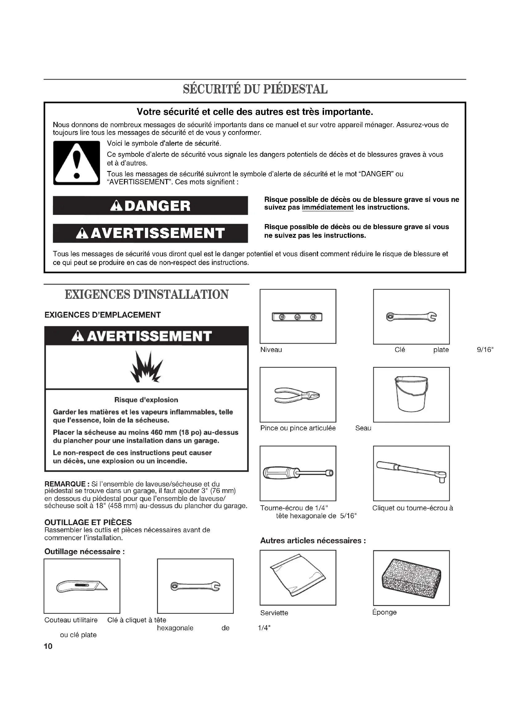 Risque possible de décès ou de blessure grave si vous ne suivez pas immédiatement les instructions. Risque possible de décès ou de blessure grave si vous ne suivez pas les instructions. Tous les messages de sécurité vous diront quel est le danger potentiel et vous disent comment réduire le risque de blessure et ce qui peut se produire en cas de non-respect des instructions. Votre sécurité et celle des autres est très importante. Nous donnons de nombreux messages de sécurité importants dans ce manuel et sur votre appareil ménager. Assurez-vous de toujours lire tous les messages de sécurité et de vous y conformer. AVERTISSEMENT DANGER Voici le symbole d’alerte de sécurité. Ce symbole d’alerte de sécurité vous signale les dangers potentiels de décès et de blessures graves à vous et à d’autres. Tous les messages de sécurité suivront le symbole d’alerte de sécurité et le mot “DANGER” ou “AVERTISSEMENT”. Ces mots signifient : Niveau Clé plate 9/16" Pince ou pince articulée Seau