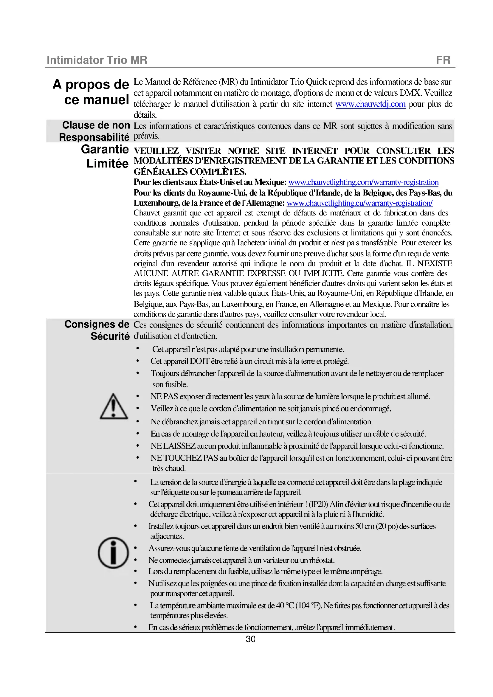 Le Manuel de Référence (MR) du Intimidator Trio Quick reprend des informations de base sur cet appareil notamment en matière de montage, d'options de menu et de valeurs DMX. Veuillez télécharger le manuel d'utilisation à partir du site internet www.chauvetdj.com pour plus de détails. Clause de non Responsabilité Les informations et caractéristiques contenues dans ce MR sont sujettes à modification sans préavis. Garantie Limitée