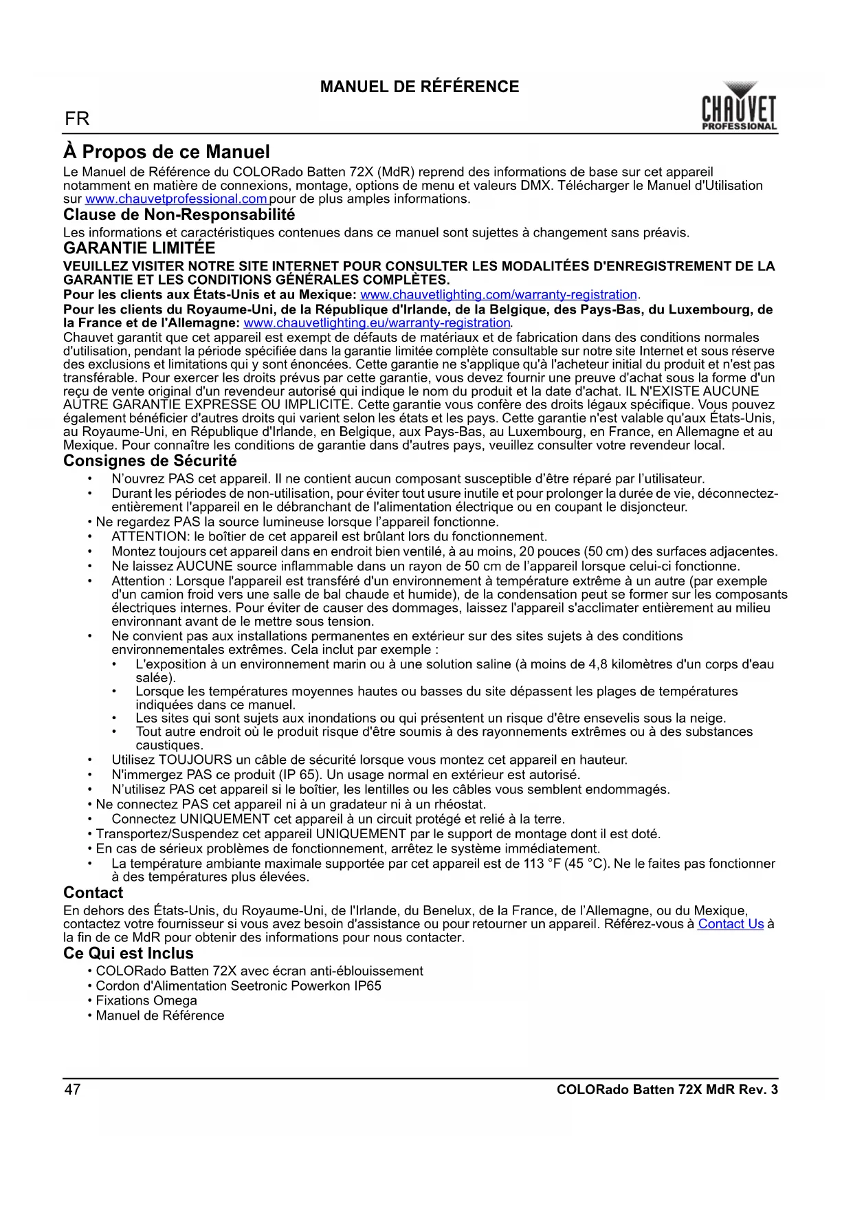 COLORado Batten 72X MdR Rev. 3 À Propos de ce Manuel Le Manuel de Référence du COLORado Batten 72X (MdR) reprend des informations de base sur cet appareil notamment en matière de connexions, montage, options de menu et valeurs DMX. Télécharger le Manuel d'Utilisation sur www.chauvetprofessional.com pour de plus amples informations. Clause de Non-Responsabilité Les informations et caractéristiques contenues dans ce manuel sont sujettes à changement sans préavis.