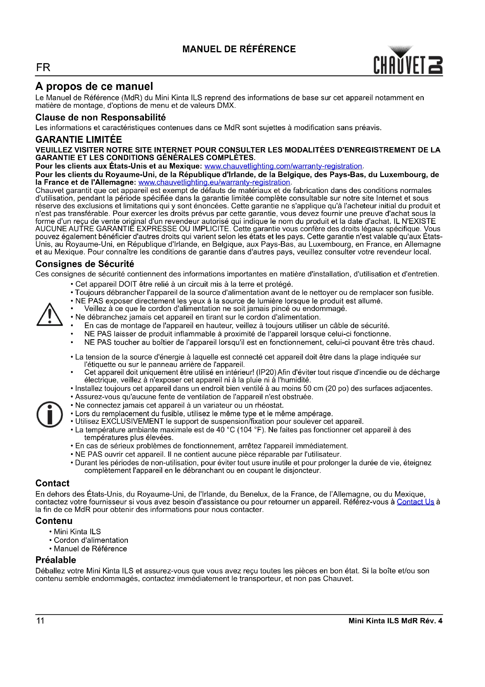 la fin de ce MdR pour obtenir des informations pour nous contacter. Contenu Préalable Déballez votre Mini Kinta ILS et assurez-vous que vous avez reçu toutes les pièces en bon état. Si la boîte et/ou son contenu semble endommagés, contactez immédiatement le transporteur, et non pas Chauvet.