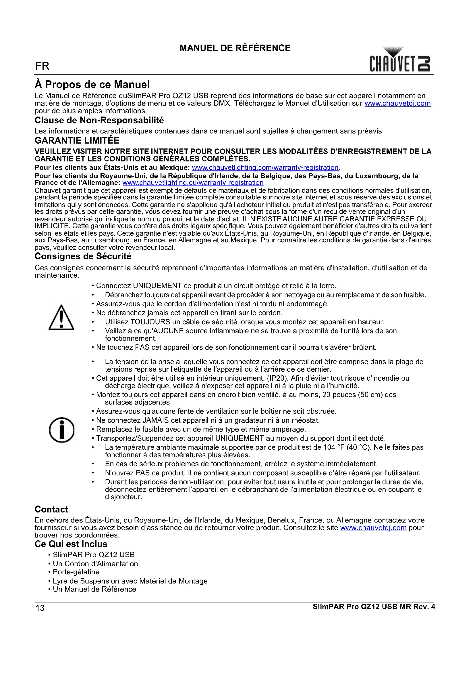 SlimPAR Pro QZ12 USB MR Rev. 4 À Propos de ce Manuel Le Manuel de Référence duSlimPAR Pro QZ12 USB reprend des informations de base sur cet appareil notamment en matière de montage, d'options de menu et de valeurs DMX. Téléchargez le Manuel d'Utilisation sur www.chauvetdj.com pour de plus amples informations. Clause de Non-Responsabilité Les informations et caractéristiques contenues dans ce manuel sont sujettes à changement sans préavis.