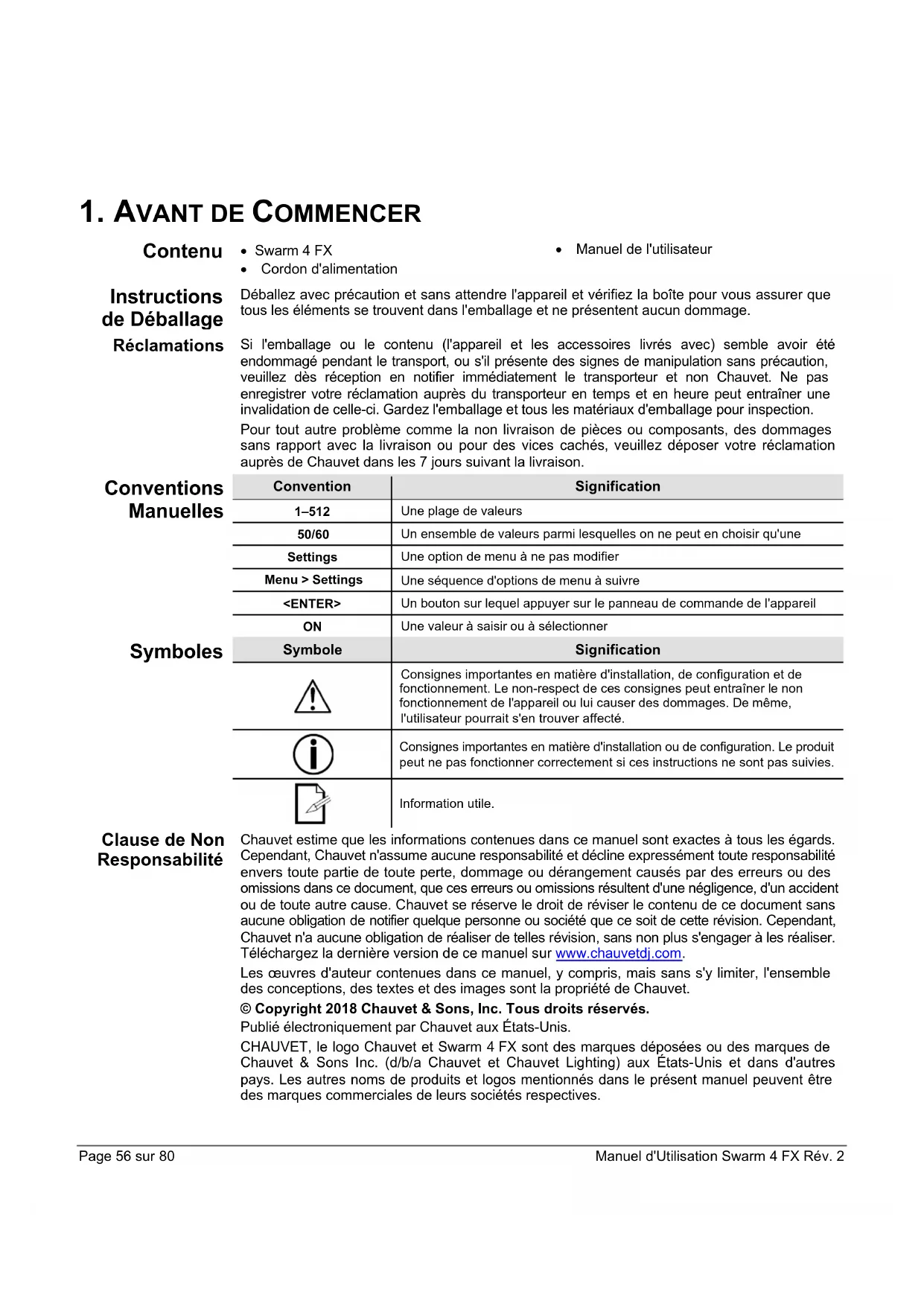 Une valeur à saisir ou à sélectionner Symboles Symbole Signification Consignes importantes en matière d'installation, de configuration et de fonctionnement. Le non-respect de ces consignes peut entraîner le non fonctionnement de l'appareil ou lui causer des dommages. De même, l'utilisateur pourrait s'en trouver affecté. Consignes importantes en matière d'installation ou de configuration. Le produit peut ne pas fonctionner correctement si ces instructions ne sont pas suivies. Information utile. Clause de Non Responsabilité Chauvet estime que les informations contenues dans ce manuel sont exactes à tous les égards. Cependant, Chauvet n'assume aucune responsabilité et décline expressément toute responsabilité envers toute partie de toute perte, dommage ou dérangement causés par des erreurs ou des omissions dans ce document, que ces erreurs ou omissions résultent d'une négligence, d'un accident ou de toute autre cause. Chauvet se réserve le droit de réviser le contenu de ce document sans aucune obligation de notifier quelque personne ou société que ce soit de cette révision. Cependant, Chauvet n'a aucune obligation de réaliser de telles révision, sans non plus s'engager à les réaliser. Téléchargez la dernière version de ce manuel sur www.chauvetdj.com. Les œuvres d'auteur contenues dans ce manuel, y compris, mais sans s'y limiter, l'ensemble des conceptions, des textes et des images sont la propriété de Chauvet. © Copyright 2018 Chauvet & Sons, Inc. Tous droits réservés. Publié électroniquement par Chauvet aux États-Unis. CHAUVET, le logo Chauvet et Swarm 4 FX sont des marques déposées ou des marques de Chauvet & Sons Inc. (d/b/a Chauvet et Chauvet Lighting) aux États-Unis et dans d'autres pays. Les autres noms de produits et logos mentionnés dans le présent manuel peuvent être des marques commerciales de leurs sociétés respectives.Manuel d'Utilisation Swarm 4 FX Rév. 2 Page 57 sur 80 Consignes de Sécurité