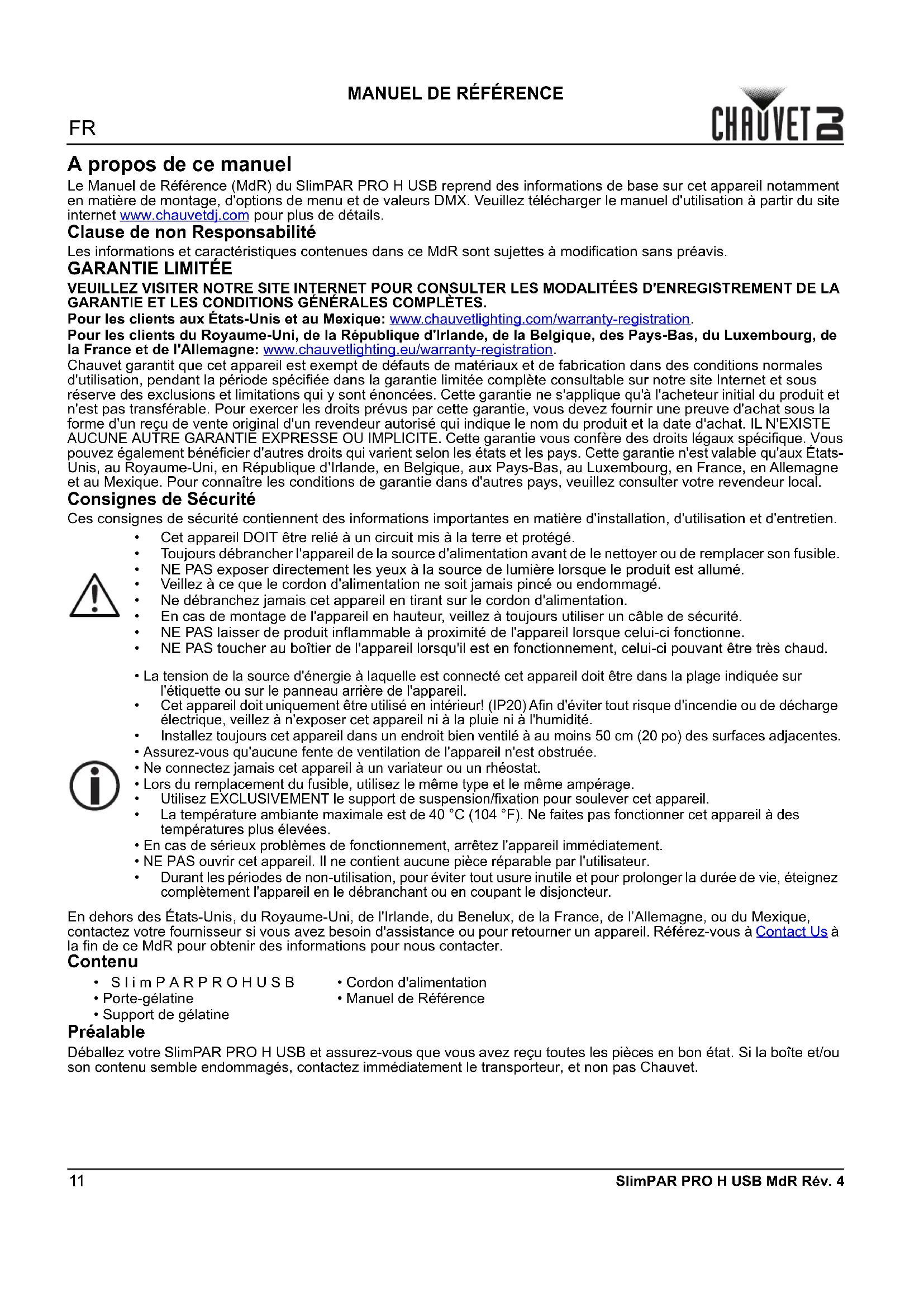 la fin de ce MdR pour obtenir des informations pour nous contacter. Contenu Préalable Déballez votre SlimPAR PRO H USB et assurez-vous que vous avez reçu toutes les pièces en bon état. Si la boîte et/ou son contenu semble endommagés, contactez immédiatement le transporteur, et non pas Chauvet.