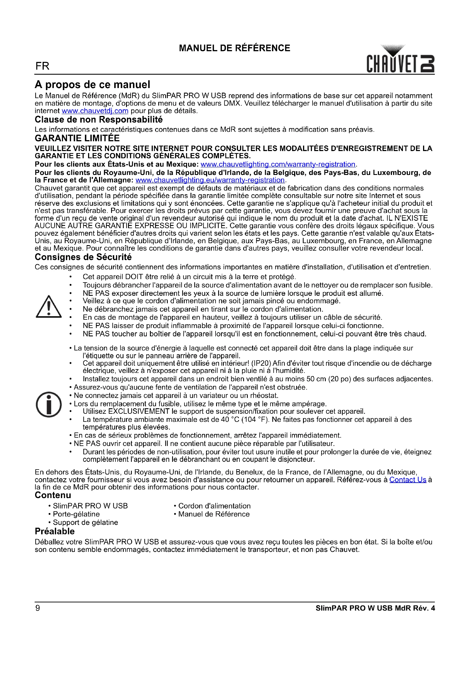 SlimPAR PRO W USB MdR Rév. 4 A propos de ce manuel Le Manuel de Référence (MdR) du SlimPAR PRO W USB reprend des informations de base sur cet appareil notamment en matière de montage, d'options de menu et de valeurs DMX. Veuillez télécharger le manuel d'utilisation à partir du site internet www.chauvetdj.com pour plus de détails. Clause de non Responsabilité Les informations et caractéristiques contenues dans ce MdR sont sujettes à modification sans préavis.