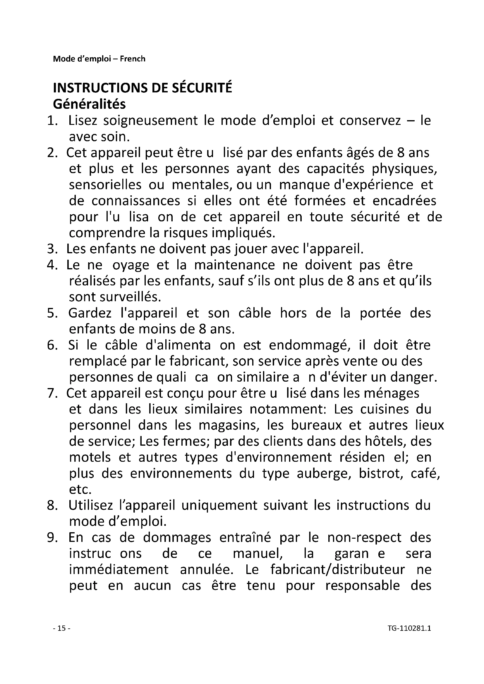 instructions de ce manuel, la garantie sera immédiatement annulée. Le fabricant/distributeur ne peut en aucun cas être tenu pour responsable des- 16 - TG-110281.1 dommages entraînés par le non-respect des instructions d’utilisation données dans ce manuel.