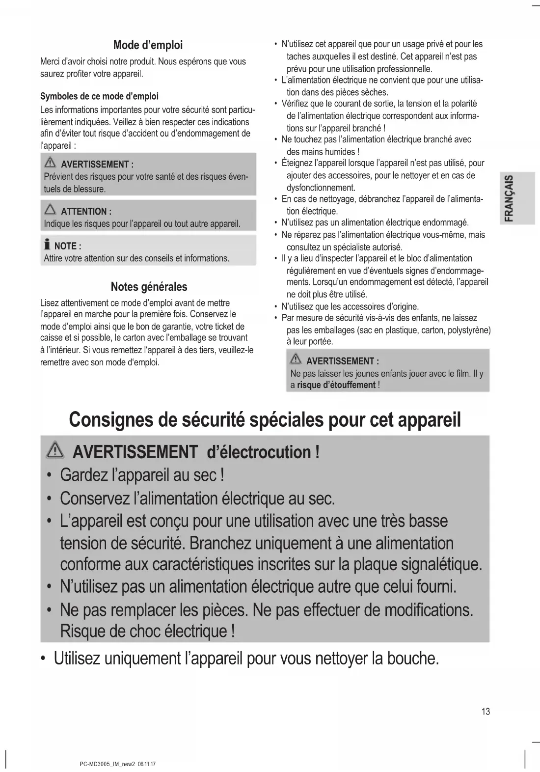 - Utilisez uniquement l’appareil pour vous nettoyer la bouche.14 PC-MD3005_IM_new2 06.11.17