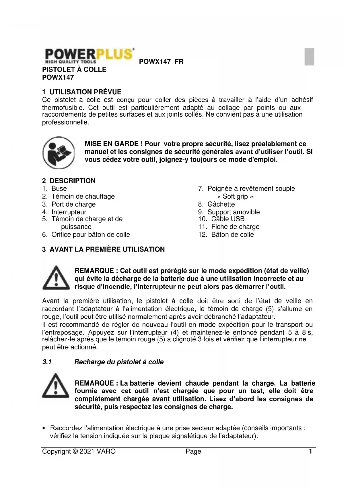 REMARQUE : Le pistolet à colle se met automatiquement hors tension après 10 minutes afin d’économiser de l’énergie.POWX147 EN Copyright © 2021 VARO 1 www.varo.com