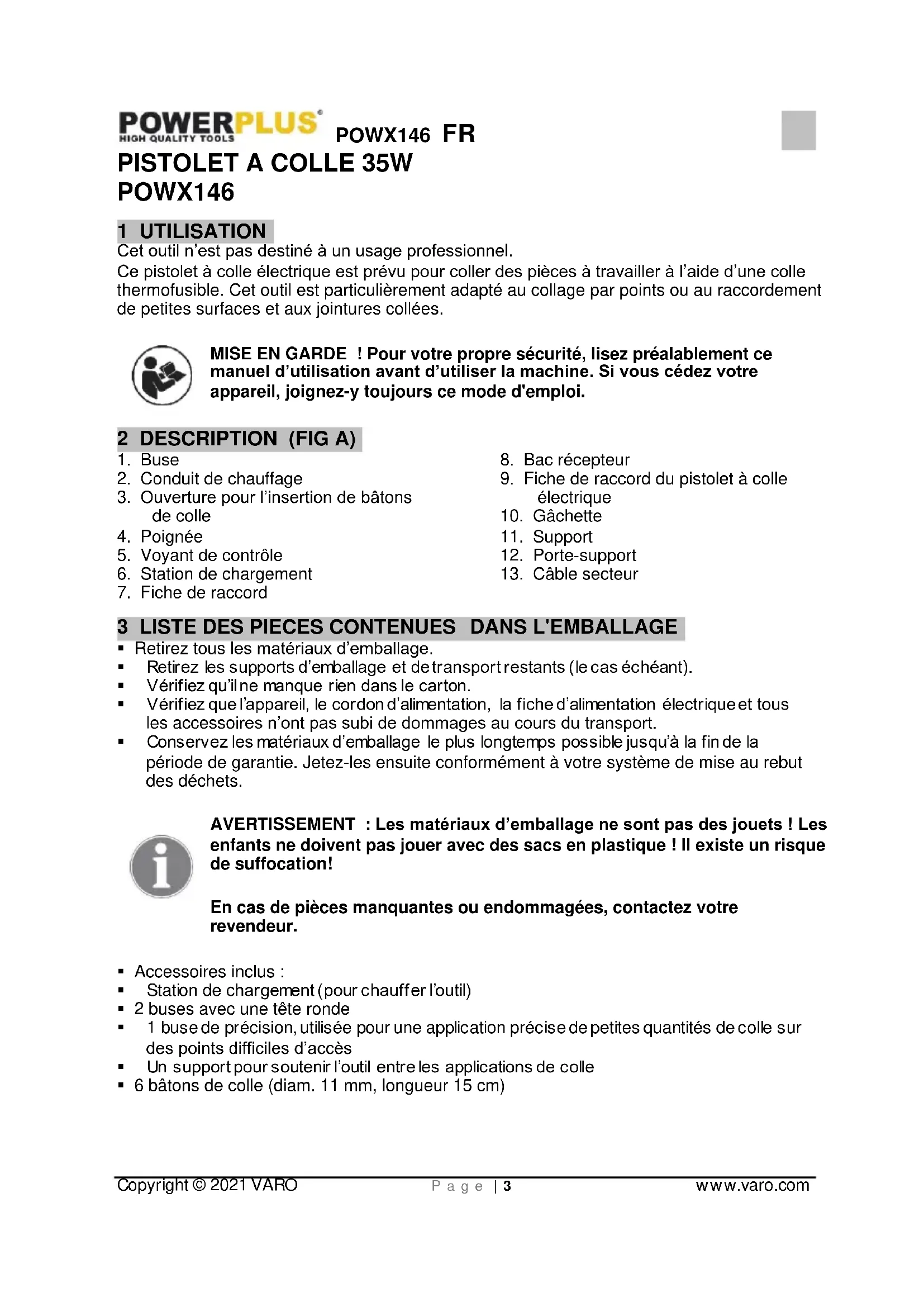 VARO N.V. – Vic. Van Rompuy N.V. Joseph Van Instraat 9 - BE2500 Lier - BELGIQUE, déclare que : appareil : Pistolet à colle marque : POWERplus modèle :POWX146 est en conformité avec les exigences essentielles et les autres dispositions pertinentes des Directives européennes applicables, basées sur l'application des normes européennes harmonisées. Toute modification non autorisée de l'appareil annule cette déclaration. Directives européennes (y compris, le cas échéant, leurs amendements à la date de la signature) ; 2011/65/EU 2014/30/EU 2014/35/EU Normes européennes harmonisées (y compris, le cas échéant, leurs amendements à la date de la signature) ; EN60335-1 : 2012 EN60335-2-45 : 2002 EN55014-1 : 2017 EN55014-2 : 2015 EN61000-3-2 : 2014 EN61000-3-3 : 2013 Détenteur de la Documentation technique : Philippe Vankerkhove, VARO – Vic. Van Rompuy N.V. Le soussigné agit au nom du PDG de l'entreprise, Ludo Mertens Réglementation – Directeur de la conformité 10/05/2021, Lier - BelgiumPOWX146 EN Copyright © 2021 VARO P a g e | 1 www.varo.com 1 APPLICATION ........................................................................... 3