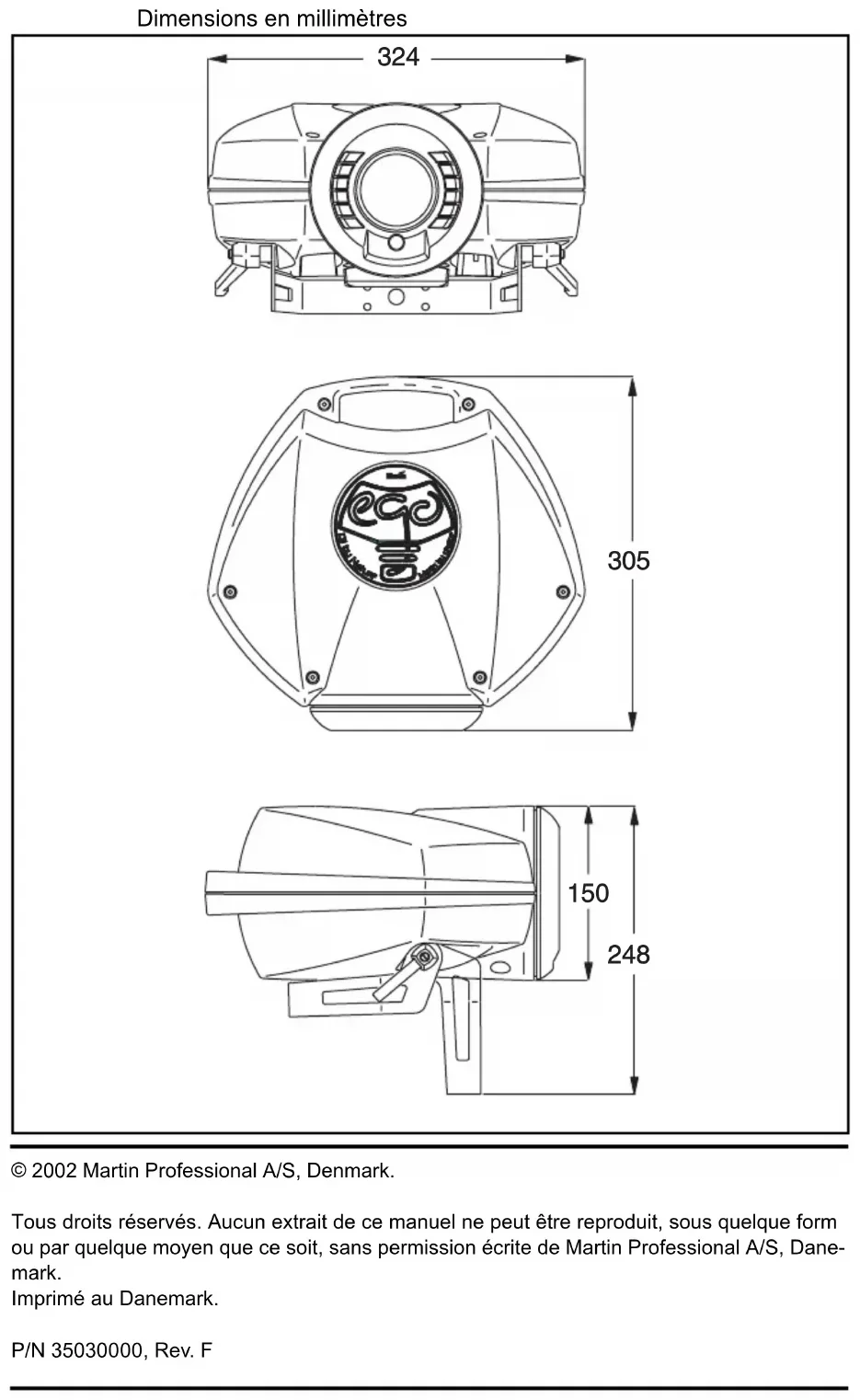 - © 2002 Martin Professional A/S, Denmark. Tous droits réservés. Aucun extrait de ce manuel ne peut être reproduit, sous quelque form ou par quelque moyen que ce soit, sans permission écrite de Martin Professional A/S, Dane- mark. Imprimé au Danemark. P/N 35030000, Rev. F3 Introduction p. 4