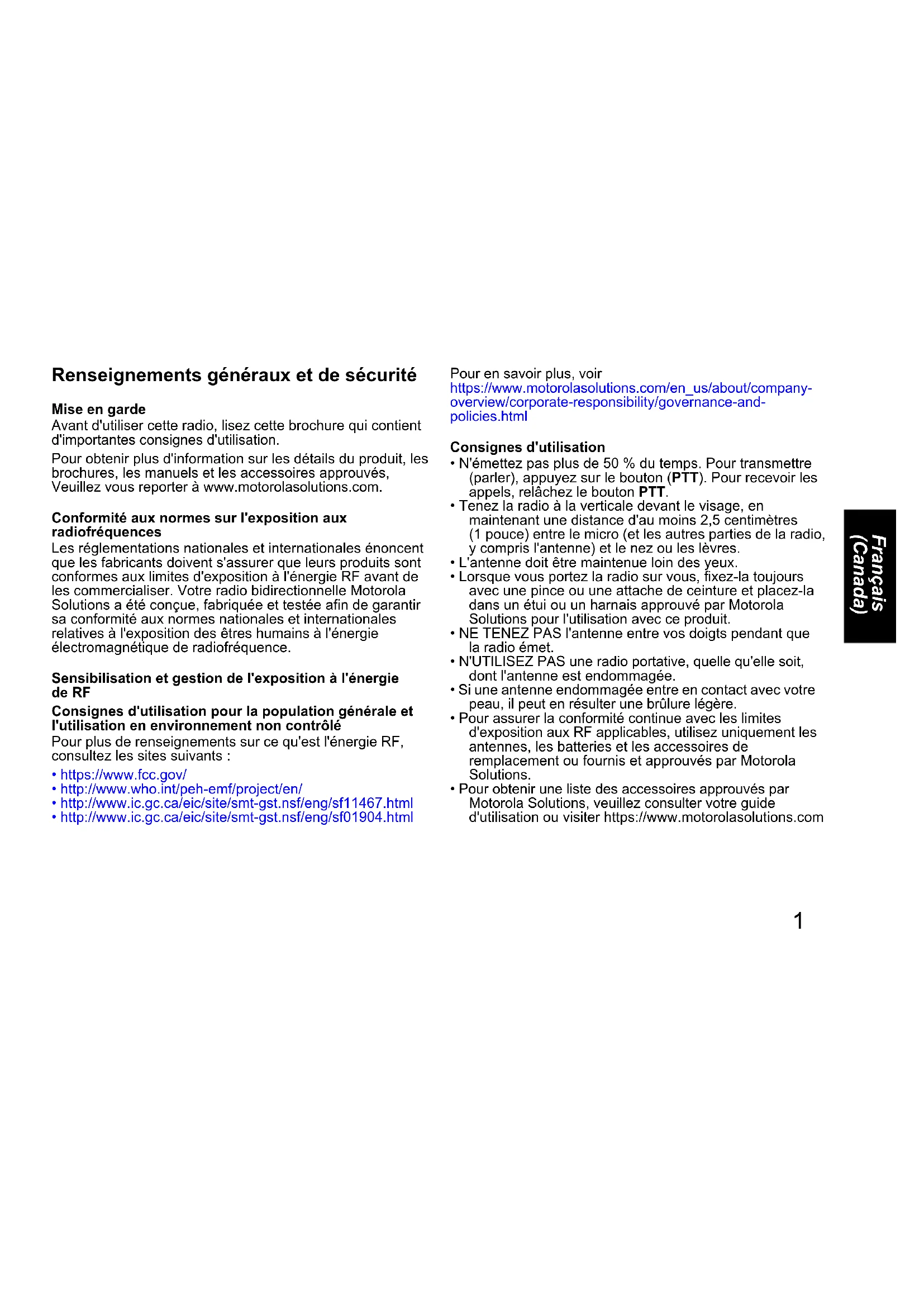 - Pour assurer la conformité continue avec les limites d'exposition aux RF applicables, utilisez uniquement les antennes, les batteries et les accessoires de remplacement ou fournis et approuvés par Motorola Solutions.