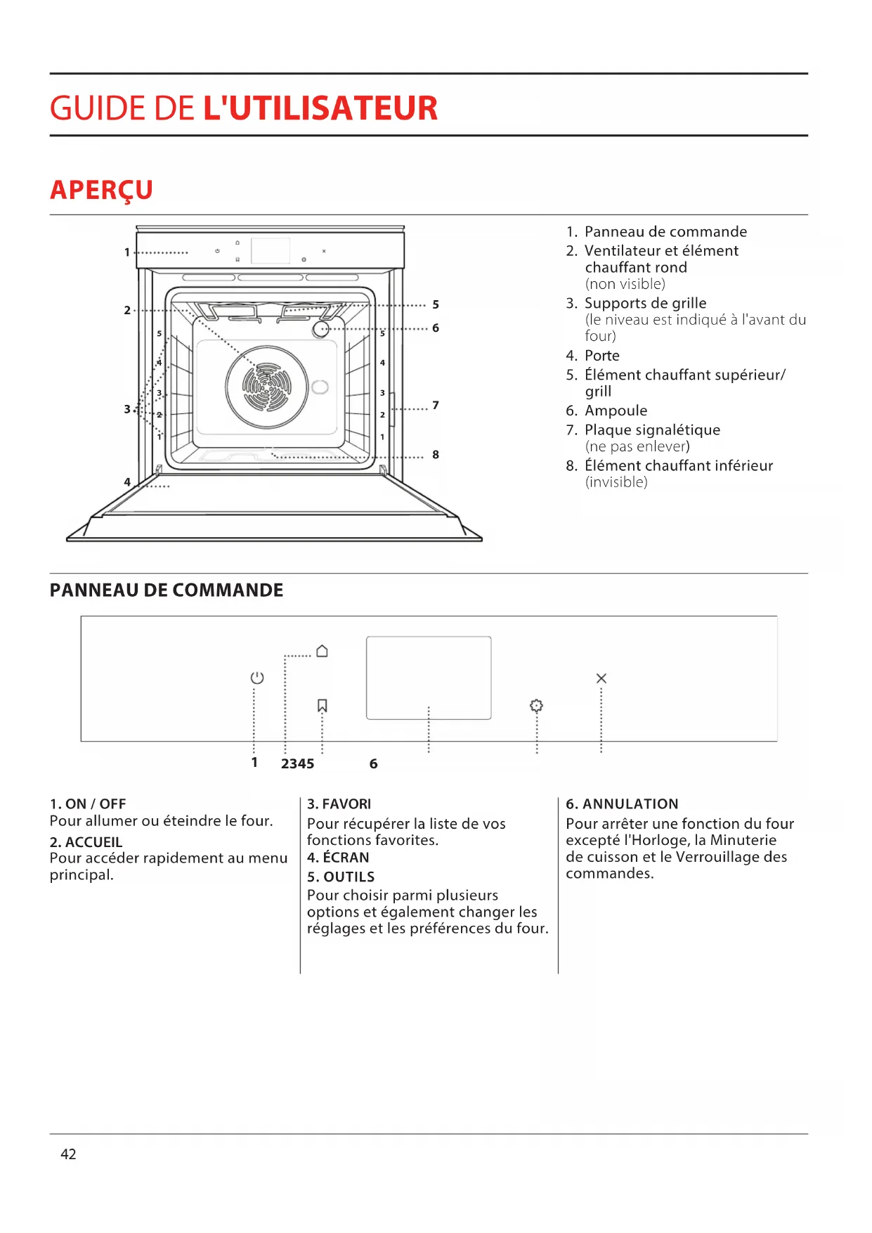 DÉPANNAGE 59 ASSISTANCE 59W42 1 Panneau de commande 2 Ventilateur et élément chauffant rond (non visible) 3 Supports de grille (le niveau est indiqué à l'avant du four) 4 Porte 5 Élément chauffant supérieur/ grill 6 Ampoule 7 Plaque signalétique (ne pas enlever) 8 Élément chauffant inférieur (invisible)