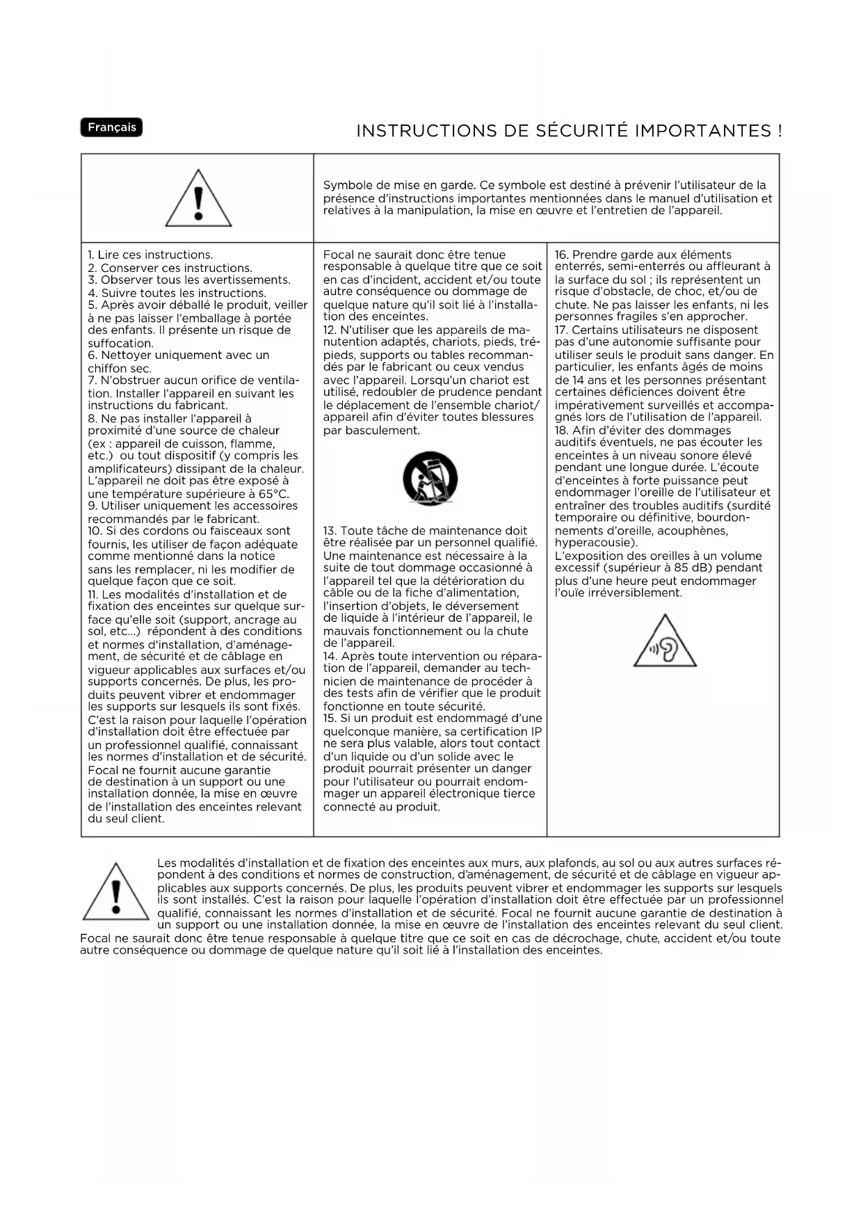 auditifs éventuels, ne pas écouter les enceintes à un niveau sonore élevé pendant une longue durée. L’écoute d’enceintes à forte puissance peut endommager l’oreille de l’utilisateur et entraîner des troubles auditifs (surdité temporaire ou définitive, bourdon- nements d’oreille, acouphènes, hyperacousie). L’exposition des oreilles à un volume excessif (supérieur à 85 dB) pendant plus d’une heure peut endommager l’ouïe irréversiblement. Les modalités d’installation et de fixation des enceintes aux murs, aux plafonds, au sol ou aux autres surfaces ré- pondent à des conditions et normes de construction, d’aménagement, de sécurité et de câblage en vigueur ap- plicables aux supports concernés. De plus, les produits peuvent vibrer et endommager les supports sur lesquels ils sont installés. C’est la raison pour laquelle l’opération d’installation doit être eectuée par un professionnel qualifié, connaissant les normes d’installation et de sécurité. Focal ne fournit aucune garantie de destination à un support ou une installation donnée, la mise en œuvre de l’installation des enceintes relevant du seul client. Focal ne saurait donc être tenue responsable à quelque titre que ce soit en cas de décrochage, chute, accident et/ou toute autre conséquence ou dommage de quelque nature qu’il soit lié à l’installation des enceintes.FR