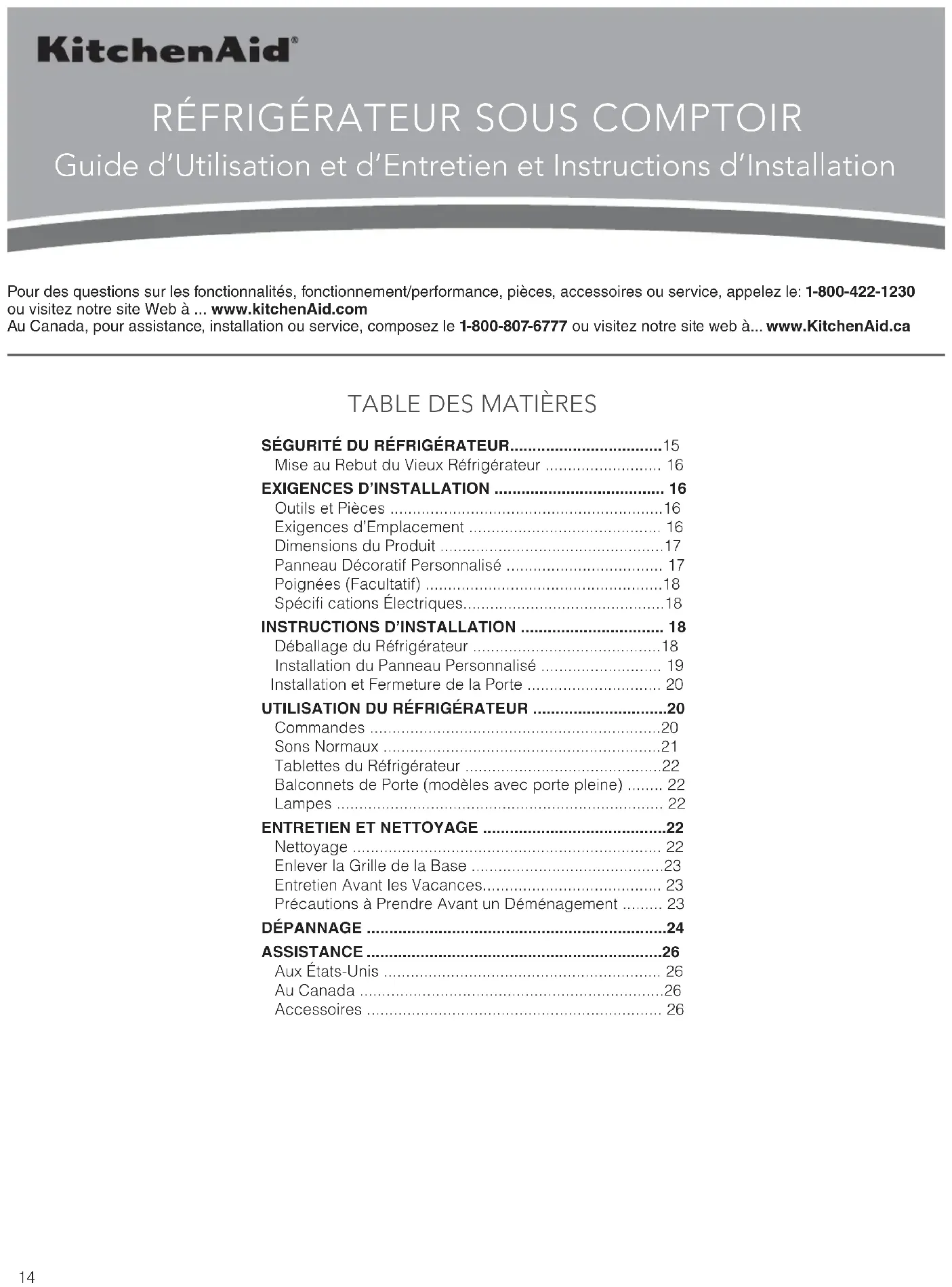 ASSISTANCE Si vous avez besoin d’un entretien: Avant de faire un appel pour assistance ou dépannage, vérifiez la section “Dépannage”. Cette vérification peut vous faire économiser le coût d’une intervention de dépannage. Pour de l’aide supplémentaire, suivez les instructions ci-dessous. Avant d’appeler, avoir à portée de la main la date d’achat, ainsi que les numéros de modèle et de série complets de l’appareil. Ces renseignements nous aideront à mieux répondre à votre demande. Consultez la page de garantie du présent manuel pour plus d’information sur l’entretien. Si vous avez besoin de pièces de rechange: Les composants doivent être remplacés par des composants similaires et l’entretien doit être effectué par une personne d’entretien autorisée par l’usine, ce qui permettra de réduire les risques d’ignition possible causés par l’utilisation de mauvaises pièces ou le mauvais entretien. Aux États-Unis Téléphoner au Centre pour l’eXpérience de la clientèle de KitchenAid sans frais: 1-800-422-1230. Nos Consultants Fournissent de l’Assistance Pour: Caractéristiques et spécifi cations de notre gamme complète d’appareils ménagers. Renseignements d’installation. Procédés d’utilisation et d’entretien. Vente d’accessoires et de pièces de rechange. Assistance spécialisée au client (langue espagnole, malentendants, malvoyants, etc.). Les références aux concessionnaires, compagnies d’entretien et de réparation, et distributeurs de pièces de rechange locaux. Les techniciens d’entretien désignés par KitchenAid sont formés pour remplir la garantie des produits et fournir un service après garantie partout aux États-Unis. Pour localiser la compagnie d’entretien désignée par KitchenAid dans votre région, vous pouvez également consulter les Pages jaunes. Pour Plus d’Assistance Si vous avez besoin de plus d’assistance, vous pouvez écrire à KitchenAid en soumettant toute question ou problème à: KitchenAid Brand Home Appliances Customer eXperience Center 553 Benson Road Benton Harbor, MI 49022-2692 Dans votre correspondance, veuillez indiquer un numéro de téléphone où l’on peut vous joindre dans la journée.Para preguntas sobre los recursos, operaciones/desempeño, piezas, accesorios o servicio, llamar al: 1-800-422-1230 o acceda a nuestro sitio web... www.kitchenAid.com En Canadá, llamar al: 1-800-807-6777, o acceda a nuestro sitio web... www.KitchenAid.ca REFRIGERADOR COMPACTO Guía de Uso y Cuidados e Instrucciones de Instalación